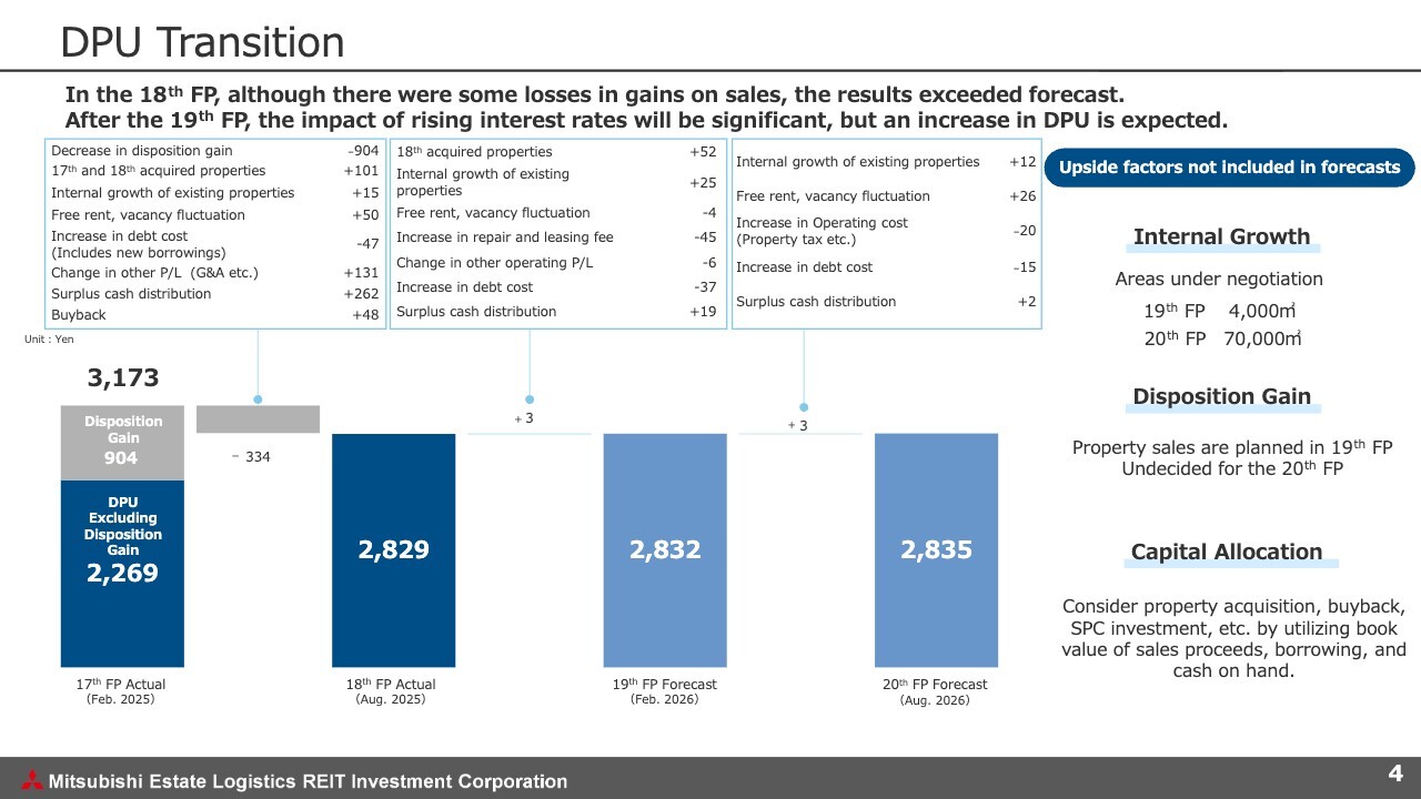 I would now like to discuss actual and forecast DPU. In the 18th fiscal period, DPU decreased from the 17th fiscal period, in which MEL recorded gains on sales. However, results exceeded forecasts due to revenue contribution from properties acquired in the 18th fiscal period, internal growth including increased rents, and buybacks. DPU excluding disposition gains is growing steadily.