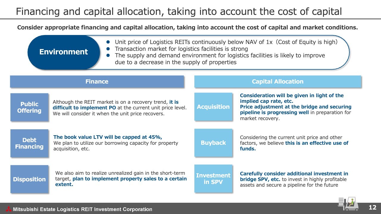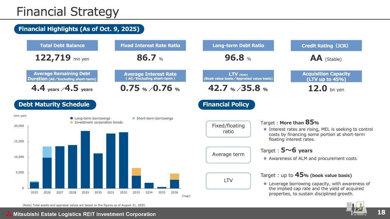 As shown at bottom right, we intend to strike a balance between stability and cost control by aiming for a fixed ratio of 85% or more and an average financing period of 5 to 6 years for future financing, taking interest rate trends into consideration. We aim to achieve disciplined external growth by utilizing our borrowing capacity, with an LTV upper limit of approximately 45% on a book value basis for the time being.