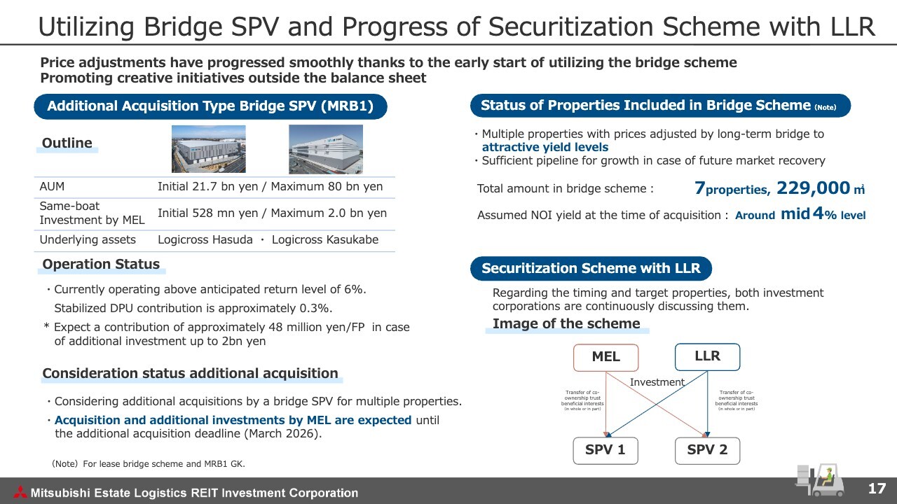 As shown on the left side of the slide, as announced in March 2025, we have begun operating a bridge SPV aimed at diversifying our bridge methods. This SPV, which has the potential to expand its scale to 80 billion yen, currently manages two Logicross properties acquired by the SPV at the start of operations, with a total value of approximately 21.7 billion yen.