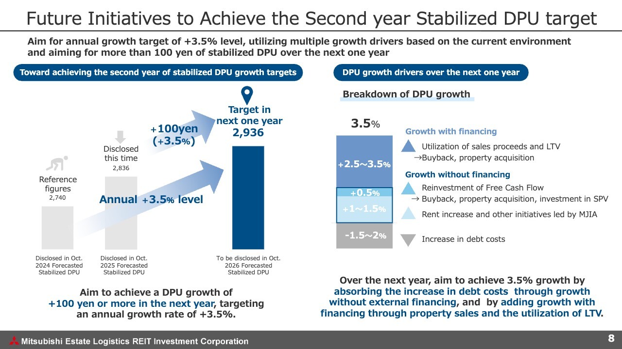 I will now discuss the second year of stabilized DPU growth. To achieve its second-year target, MEL aims to achieve stabilized DPU growth of 100 yen or more over the next year. Specifically, the target for the stabilized DPU that will be announced one year from now is set at 2,936 yen or higher.
