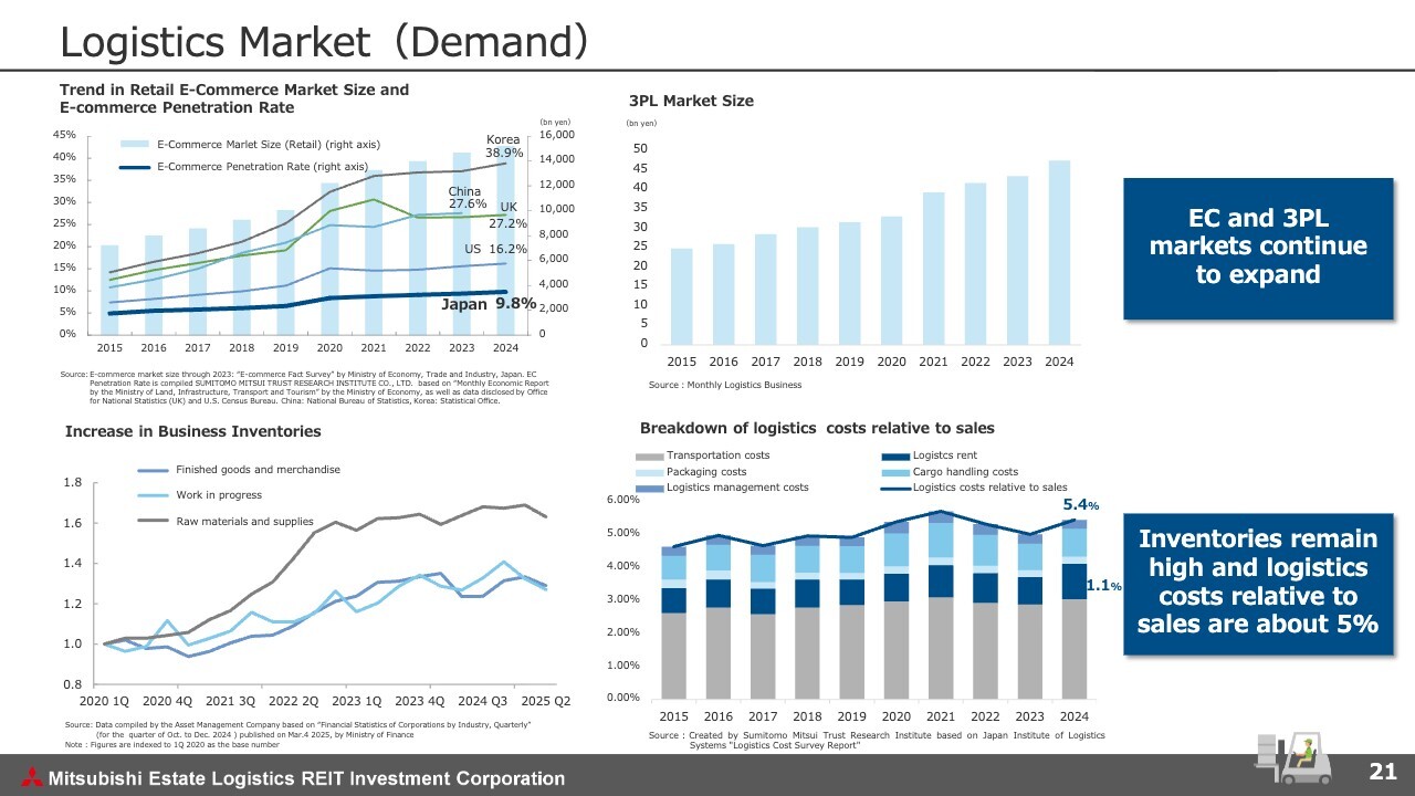 This slide looks at the demand trend for logistics facilities. Due to the increasing global adoption of e-commerce and the expansion of logistics outsourcing by business operators, we expect solid demand for efficiently usable logistics facilities for lease.