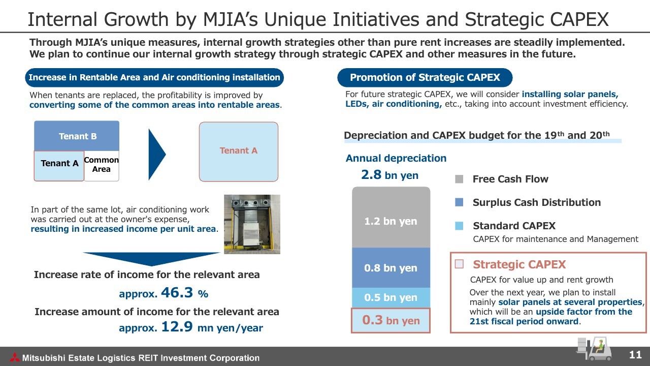 Here I would like to discuss internal growth specific to MJIA. The left side of the slide shows an example of a solution we implemented during renewal of a contract with a tenant. By combining the tenant's desire to move out with the need for expansion within the building and by partitioning space into optimal areas, we were able to convert a portion of the common area space into a private area, thereby increasing the rentable ratio.
