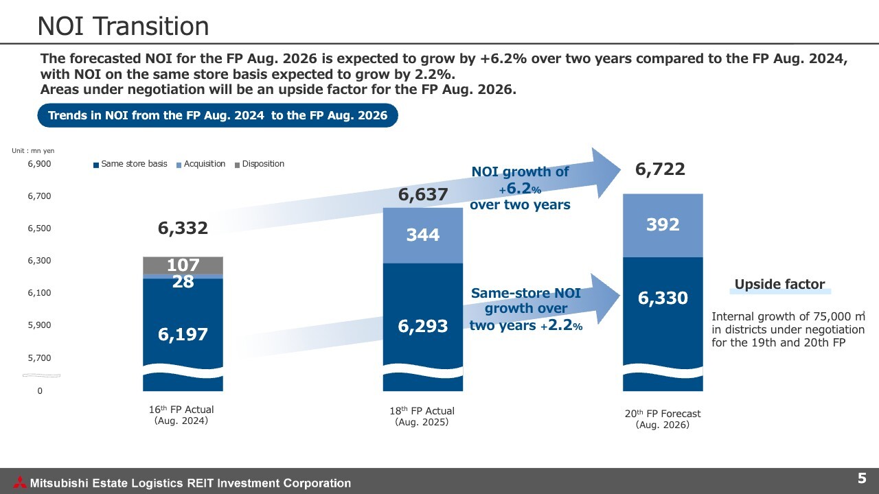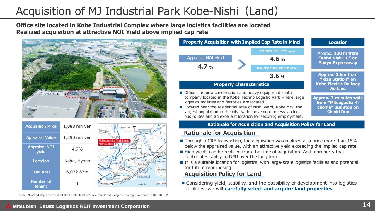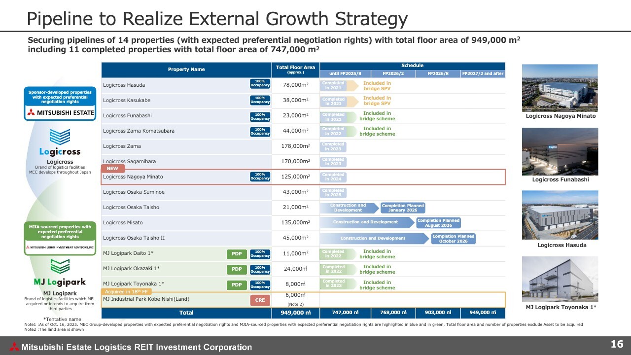 Looking at external growth, MEL acquired MJ Industrial Park Kobe-Nishi at an attractive yield level. We are also making steady progress in securing a solid pipeline.