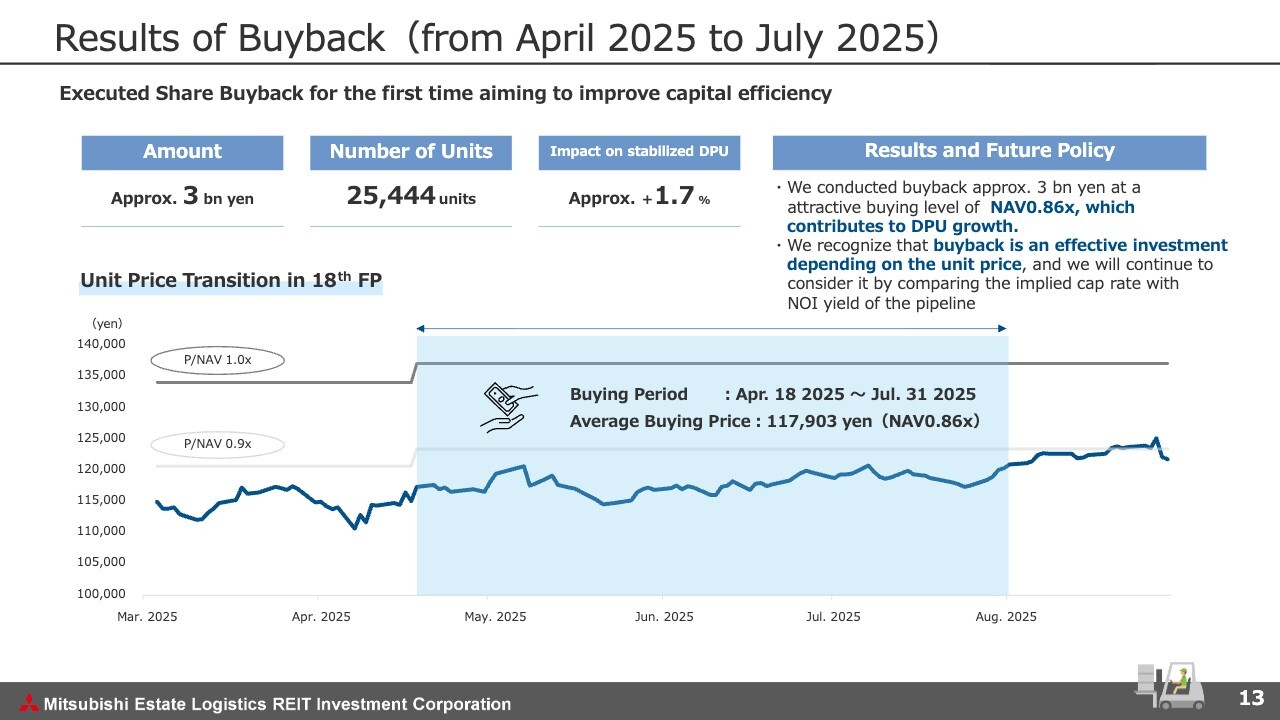 I will next look at the most recent operational highlights, beginning with the results of buybacks. Between April and July 2025, MEL conducted buybacks of 25,444 units totaling approximately 3 billion yen in value, and retired the units during the fiscal period under review.