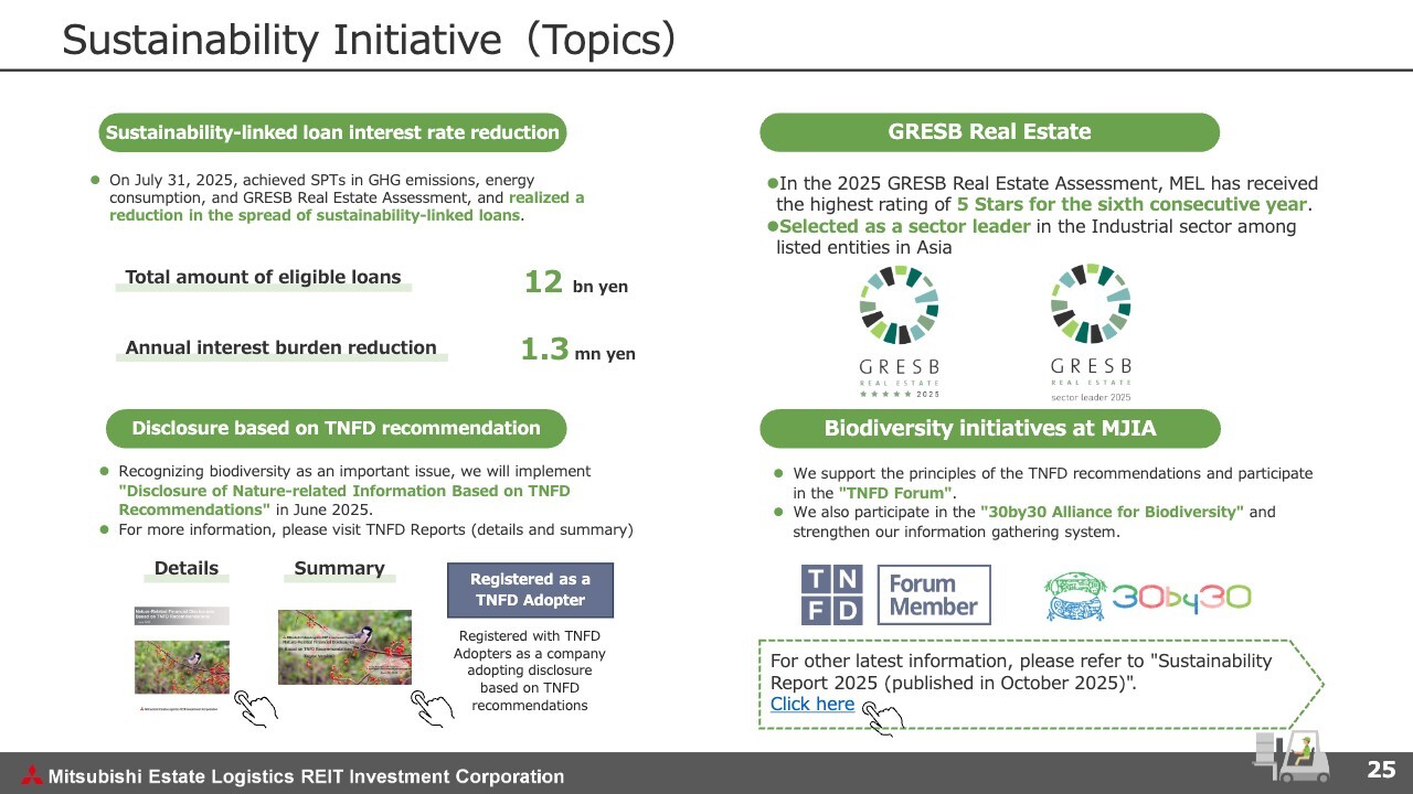 As shown at upper right, in the 2025 GRESB Real Estate Assessment, MEL received the highest rating of 5 Stars for the sixth consecutive year. MEL was also selected as a sector leader in the logistics and industrial sector among listed entities in Asia, demonstrating its proactive approach to sustainability.