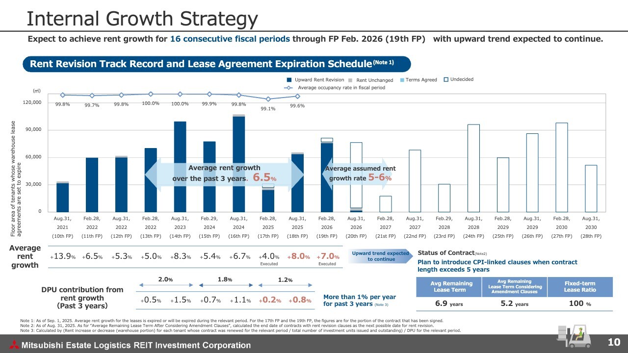 Looking at internal growth, we expect to achieve our 16th consecutive period of rent increases, with rent increasing by 8% for the period under review. In the current 19th fiscal period, we have achieved a 7% rent increase in areas where lease agreements have already been signed, and continue to achieve strong internal growth.