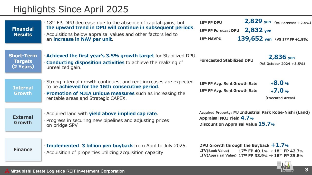 As of today, we expect a DPU of 2,836 yen, representing a growth of approximately 3.5% from the 2,740 yen announced in October 2024 and achieving our first-year target. We believe this is the result of proactive management, including buybacks, the realization of greater-than-expected internal growth, and the acquisition of high-yield properties utilizing LTV.