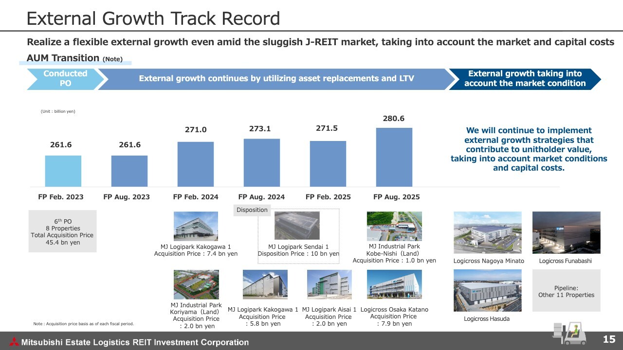 This slide shows MEL's external growth track record from fiscal 2023. Through the fiscal year ended February 2023, the unit prices of logistics REITs remained relatively high, and we were able to acquire large-scale properties through public offerings.