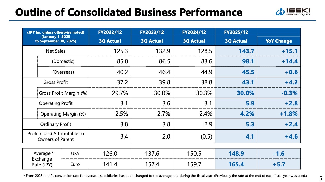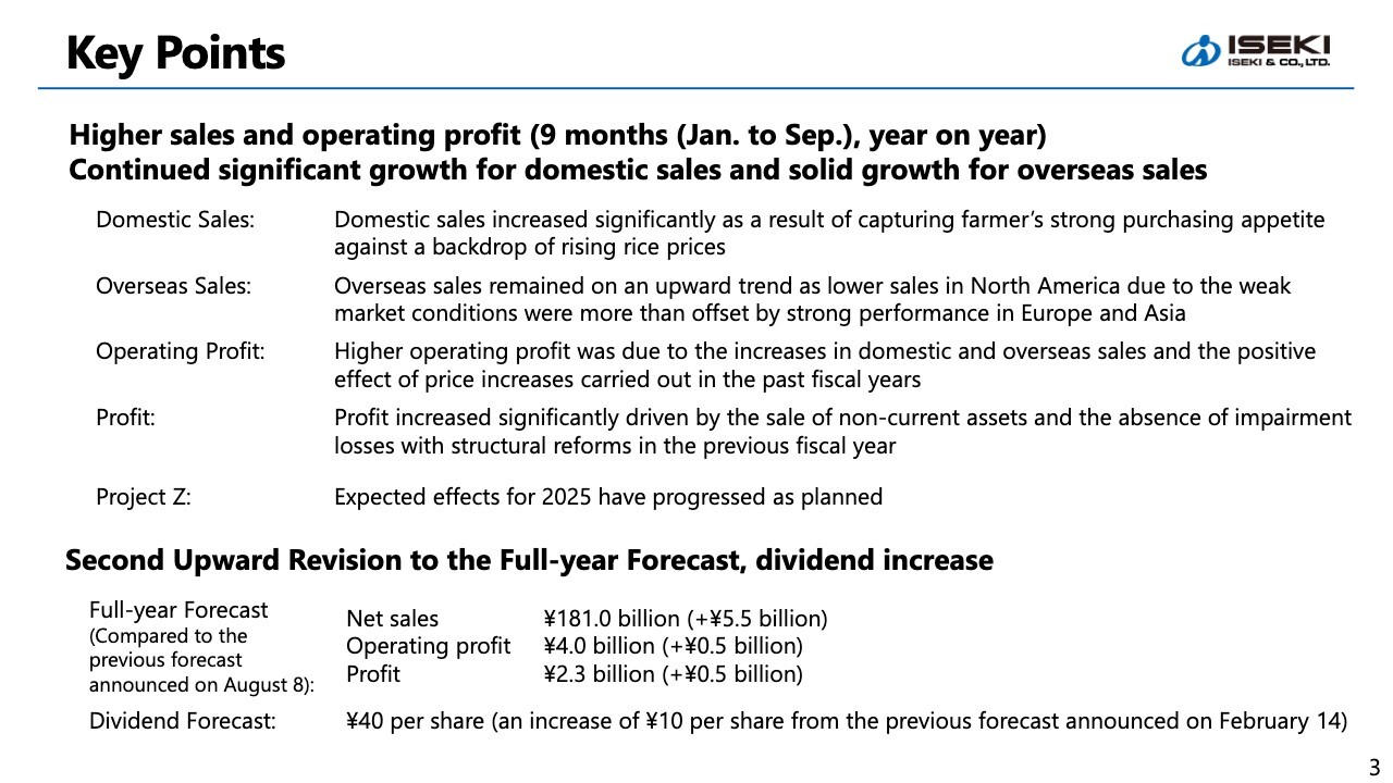 Let me begin by summarizing the key points of the financial results. For 3Q FY12/2025, sales and operating profit increased year on year. Domestically, we continued to record a significant increase in sales, while overseas sales also remained steady and posted an increase. The slide outlines the main components of domestic and overseas sales. I will explain the details later.