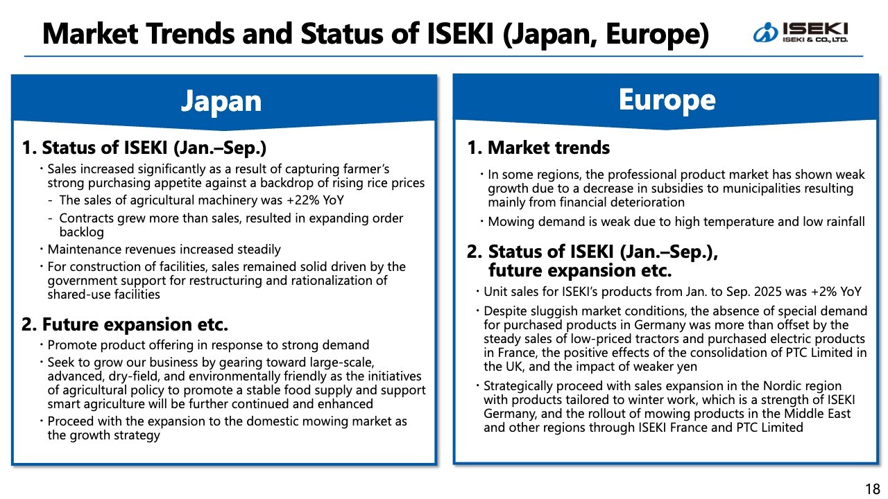 Going forward, we will proceed with sales expansion in the Nordic region with products tailored to winter work, which is a strength of ISEKI Germany, and the rollout of mowing products in the Middle East through ISEKI France and PTC Limited.