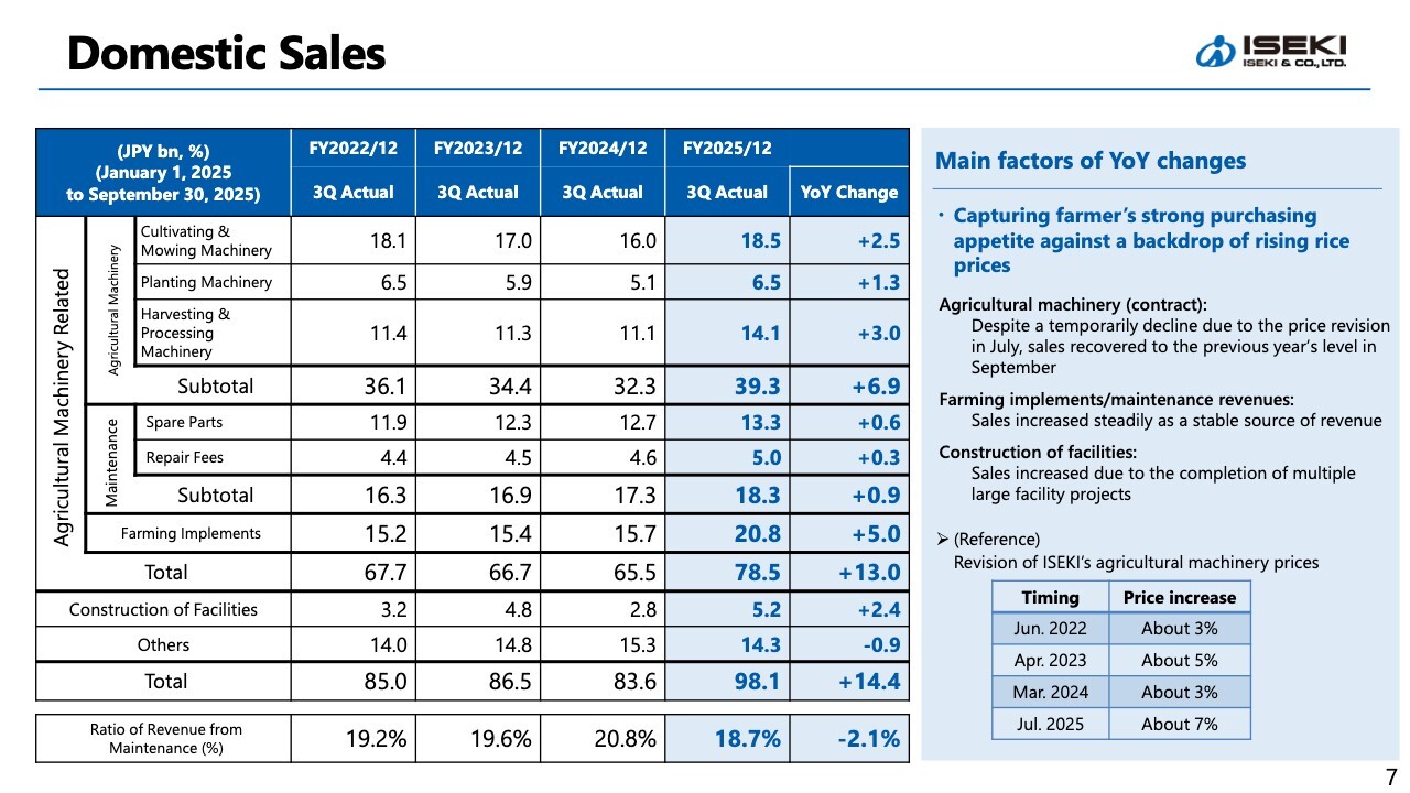 Maintenance services also rose by ¥0.9 billion YoY, and farming implements recorded an increase of ¥5.0 billion. These segments, such as maintenance and farming implements, continue to show steady growth as stable revenue sources.