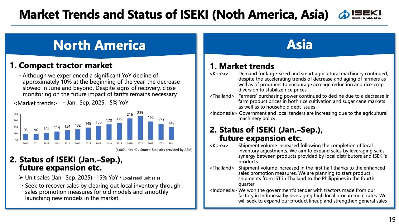 From 4Q, we plan to begin shipments to the Philippines as part of a new regional expansion initiative. In Indonesia, government and municipal tenders are increasing as part of agricultural mechanization policies, and we are strengthening initiatives to capture these orders and grow sales.