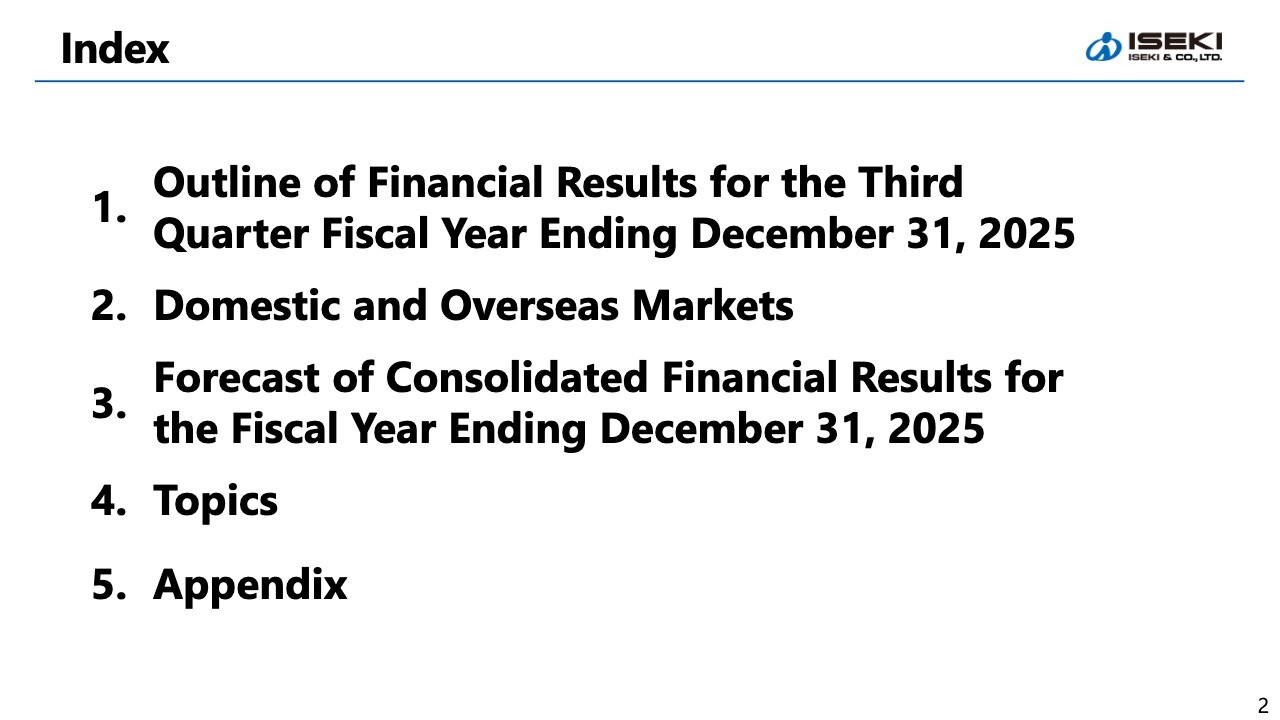 Shiro Tomiyasu (hereinafter, Tomiyasu): Good afternoon. I am Shiro Tomiyasu, President and Representative Director of ISEKI & CO., LTD. Thank you very much for taking the time to join our briefing today. I would also like to express my sincere appreciation for your continued guidance and support toward our IR activities. Today, I will proceed in accordance with the index shown.