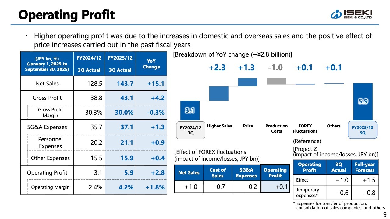 As shown in the table at the lower right of the slide, the weaker yen contributed a positive impact of ¥1.0 billion to net sales and ¥0.1 billion to operating profit. The initiatives under Project Z generated effects totaling + ¥1.0 billion over the nine months from January to September 2025.