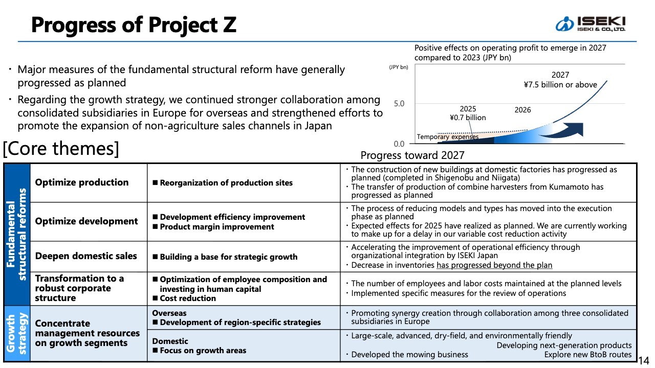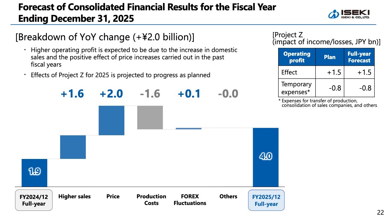 For the current fiscal year, Project Z will contribute approximately ¥1.5 billion, while one-time costs of ¥0.8 billion are expected. These include costs related to the merger of our distribution subsidiary, ISEKI Japan, and expenses associated with transferring production from Matsuyama to Kumamoto.