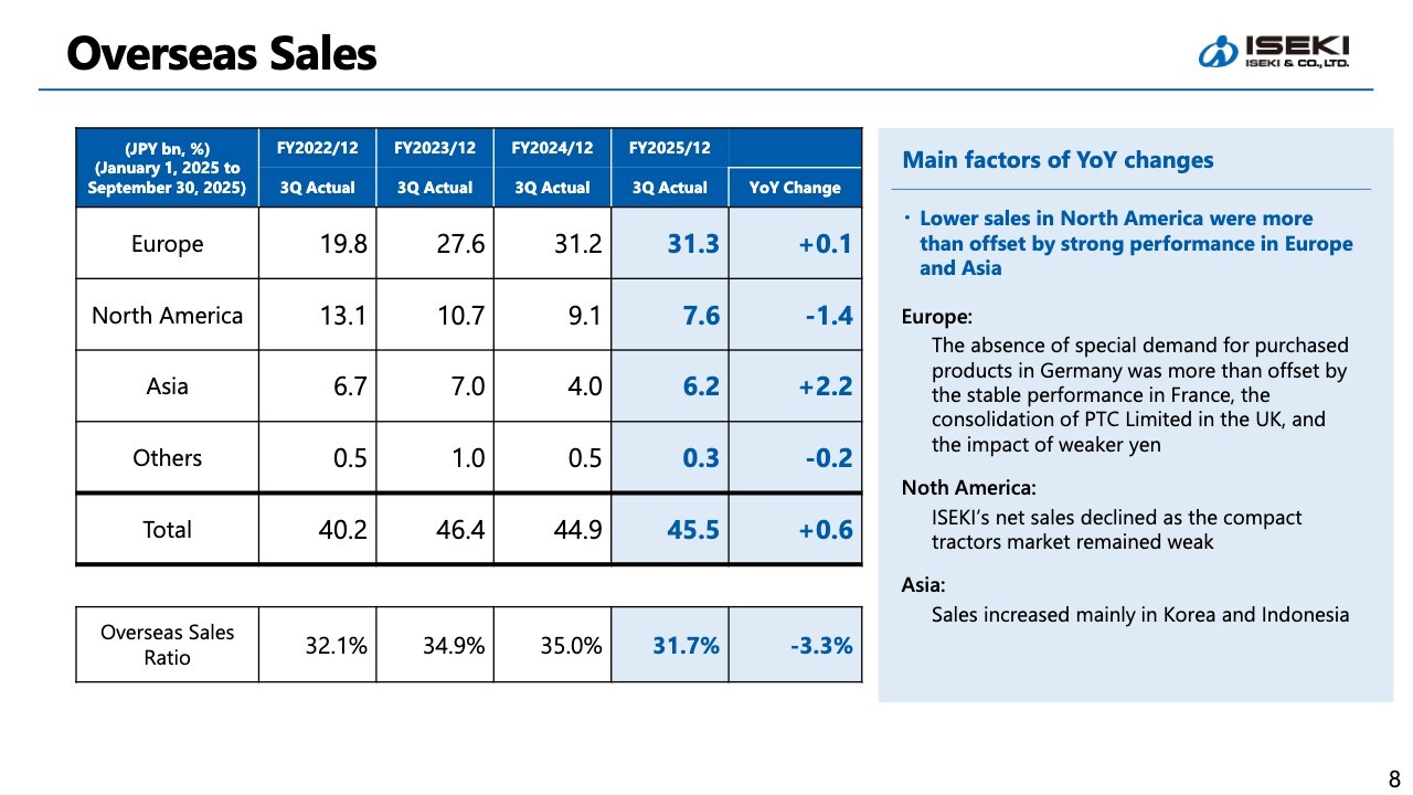 In North America, the compact tractors market remained weak, resulting in a ¥1.4 billion YoY decline. In contrast, Asia performed well, with South Korea and Indonesia contributing to a ¥2.2 billion YoY increase.