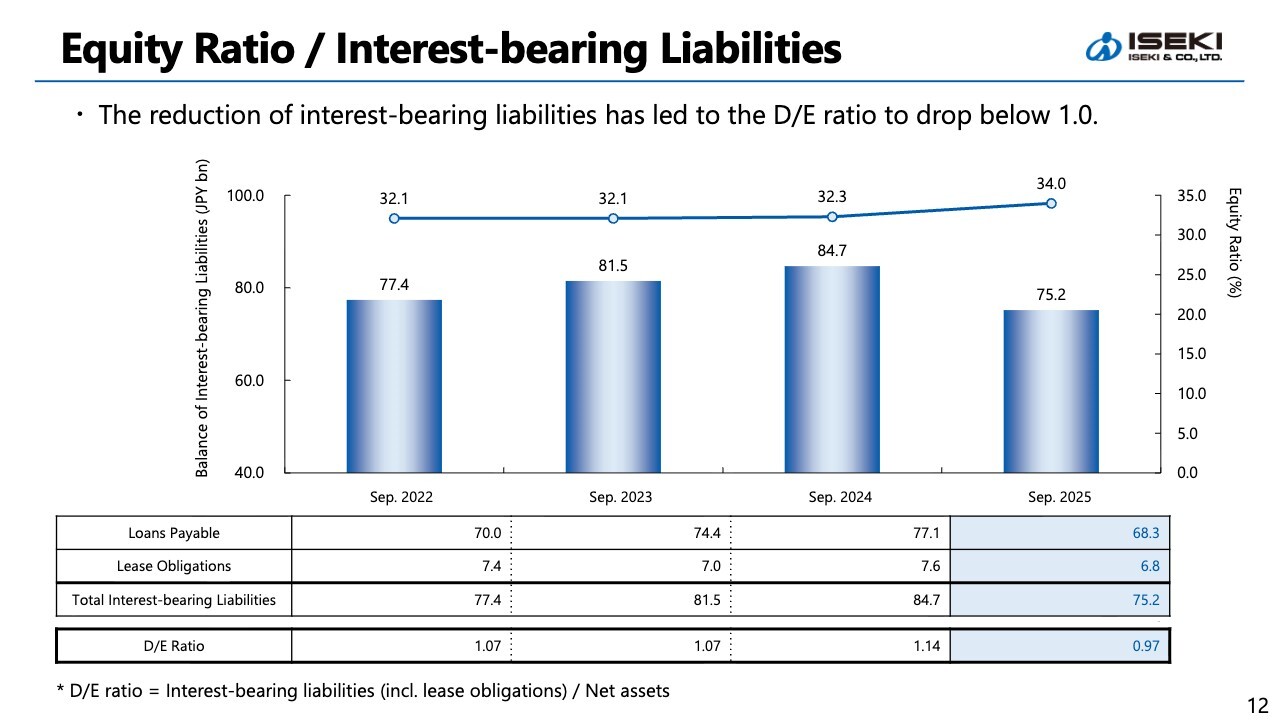 Interest-bearing liabilities decreased by ¥9.4 billion YoY. Both the reduction in inventories and the reduction in interest-bearing liabilities are progressing ahead of the assumptions made at the beginning of the fiscal year.