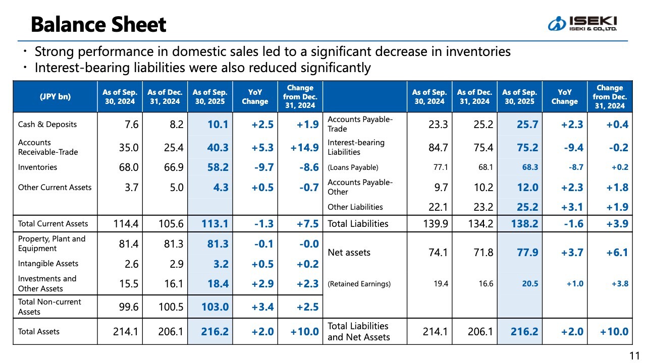 Regarding inventories, which we recognize as one of our most critical issues, we achieved a significant reduction of ¥9.7 billion YoY, supported by strong domestic sales. This reduction includes increases associated with the consolidation of certain overseas subsidiaries.