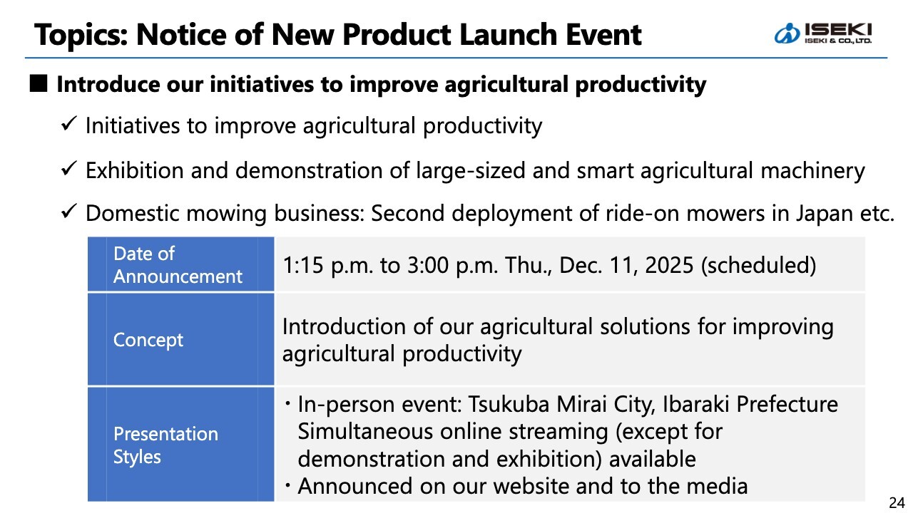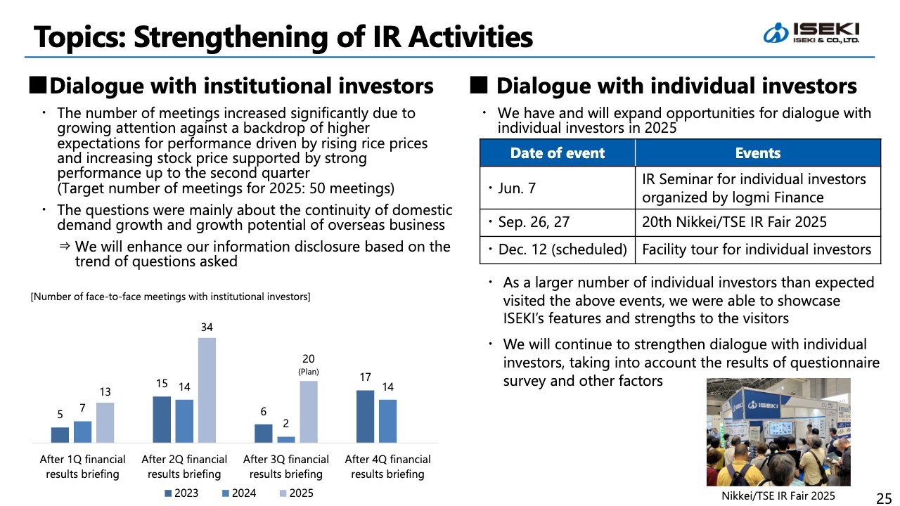 We are also expanding our engagement with individual investors. Attendance at various events has far exceeded our expectations, and we believe these opportunities have helped us showcase ISEKI’s features and strengths to the visitors.