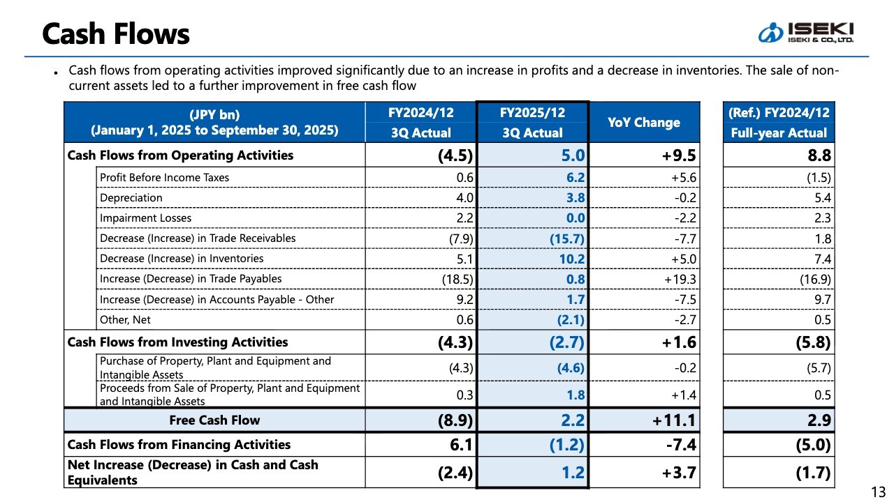 Driven by higher profit and reduced inventories, cash flows from operating activities returned to positive territory. As I mentioned earlier, we expect further collection of accounts receivable in 4Q. For the full fiscal year, we anticipate continued improvement in cash flows from operating activities.