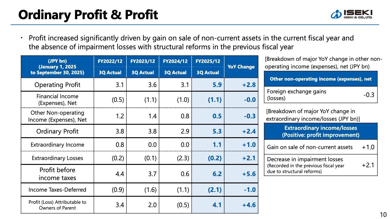 Let me now explain the items below ordinary profit. Ordinary profit saw a lower YoY increase than operating profit, mainly due to a decline of roughly ¥0.3 billion in foreign exchange gains (losses) as shown on the right side of the slide.