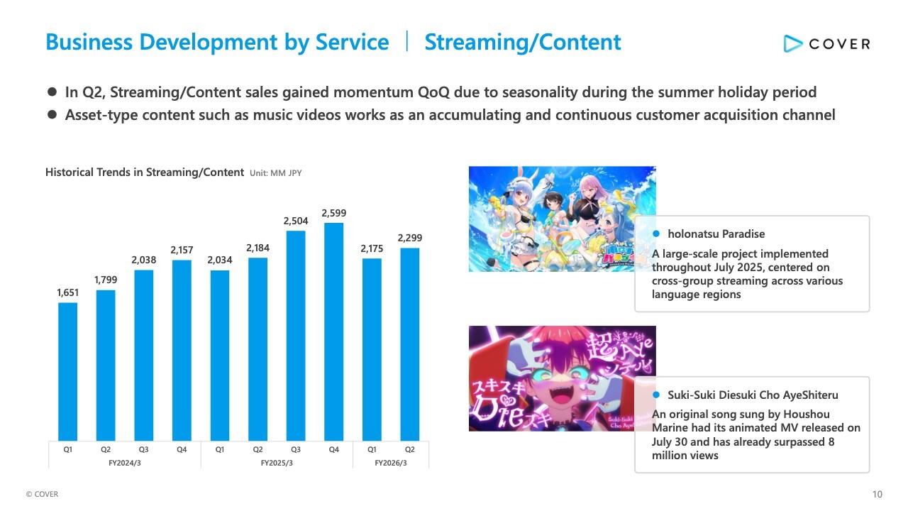 Tanigo: I will now explain the current status of business development by service, beginning with the Streaming/Content service. In Q2, Streaming/Content sales gained momentum QoQ due to increased viewership during the summer holiday period. Asset-type content such as music videos works as an accumulating and continuous customer acquisition channel.