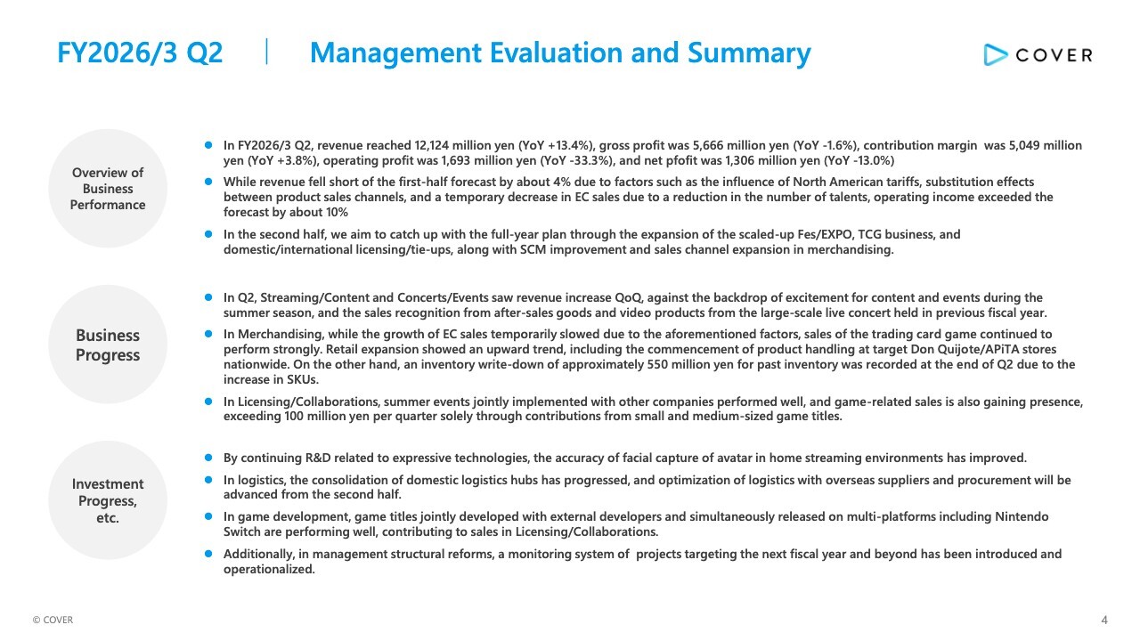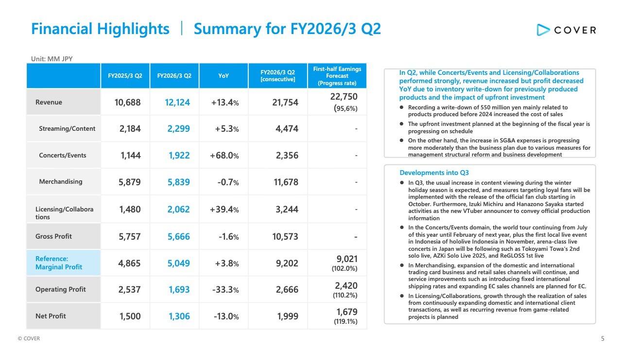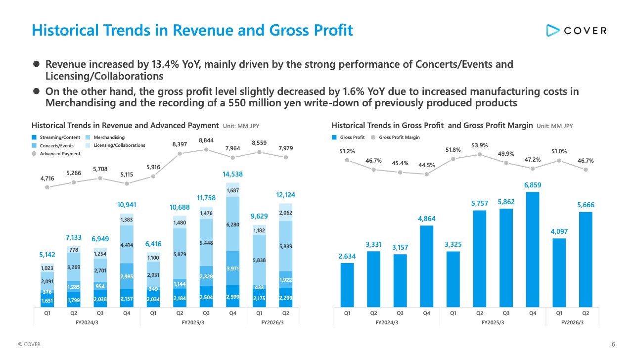 First, the historical trends in revenue and gross profit. Q2 revenue increased by 13.4% YoY, mainly driven by the strong performance of Concerts/Events and Licensing/Collaborations. On the other hand, the gross profit level slightly decreased by 1.6% YoY due to increased manufacturing costs in Merchandising and the recording of a ¥550 million write-down of previously produced products.