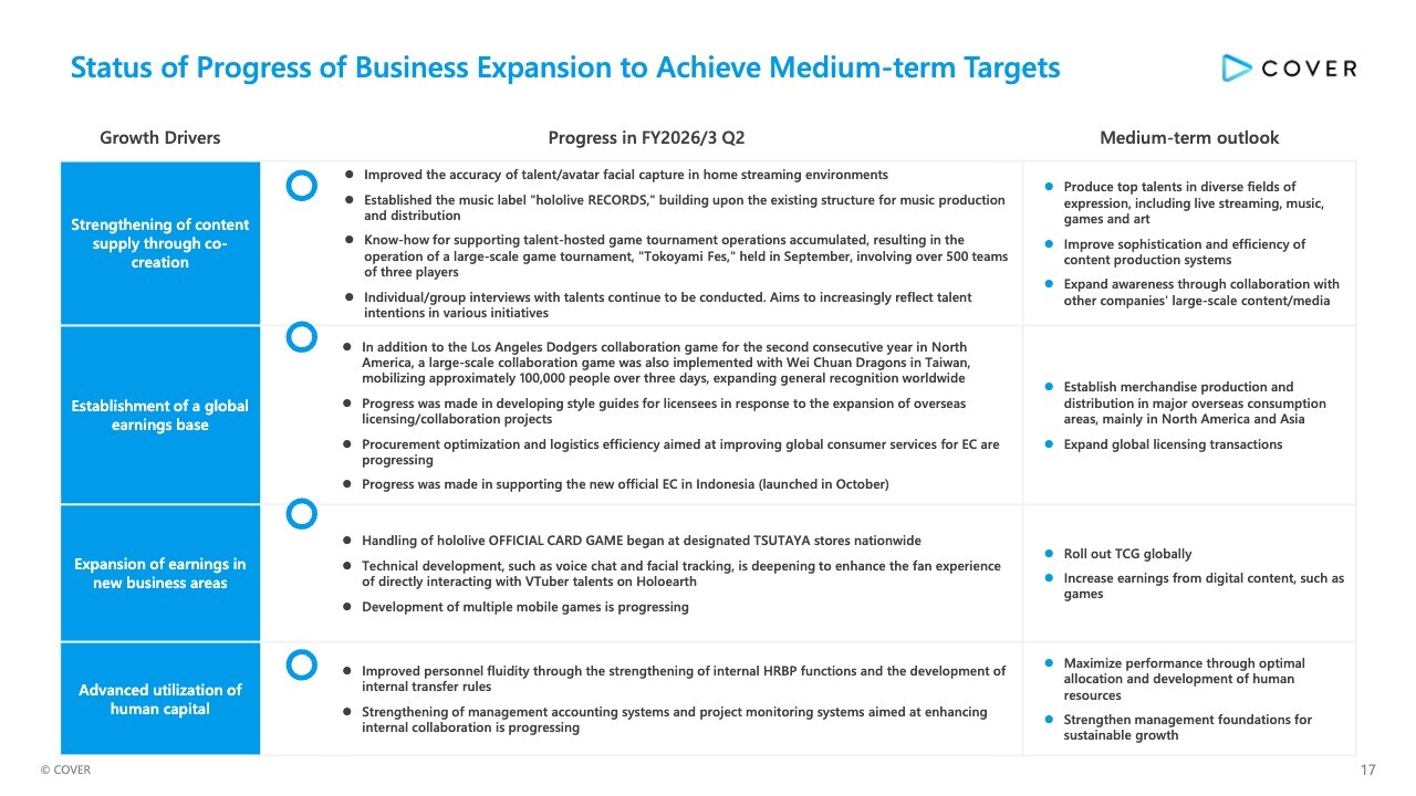 In the third growth driver, “Expansion of earnings in new business areas,” we began handling of hololive OFFICIAL CARD GAME at designated TSUTAYA stores nationwide. Technical development, such as voice chat and facial tracking, is deepening to enhance the fan experience of directly interacting with VTuber talents on Holoearth.