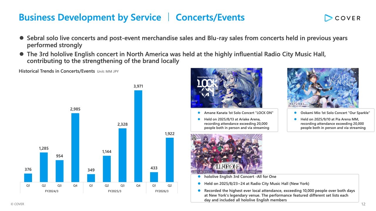 Here is an update on the business development of Concerts/Events. Strong sales from multiple solo live concerts, post-event merchandise sales, and Blu-ray sales from past shows drove a 68% YoY revenue increase in Concerts/Events.