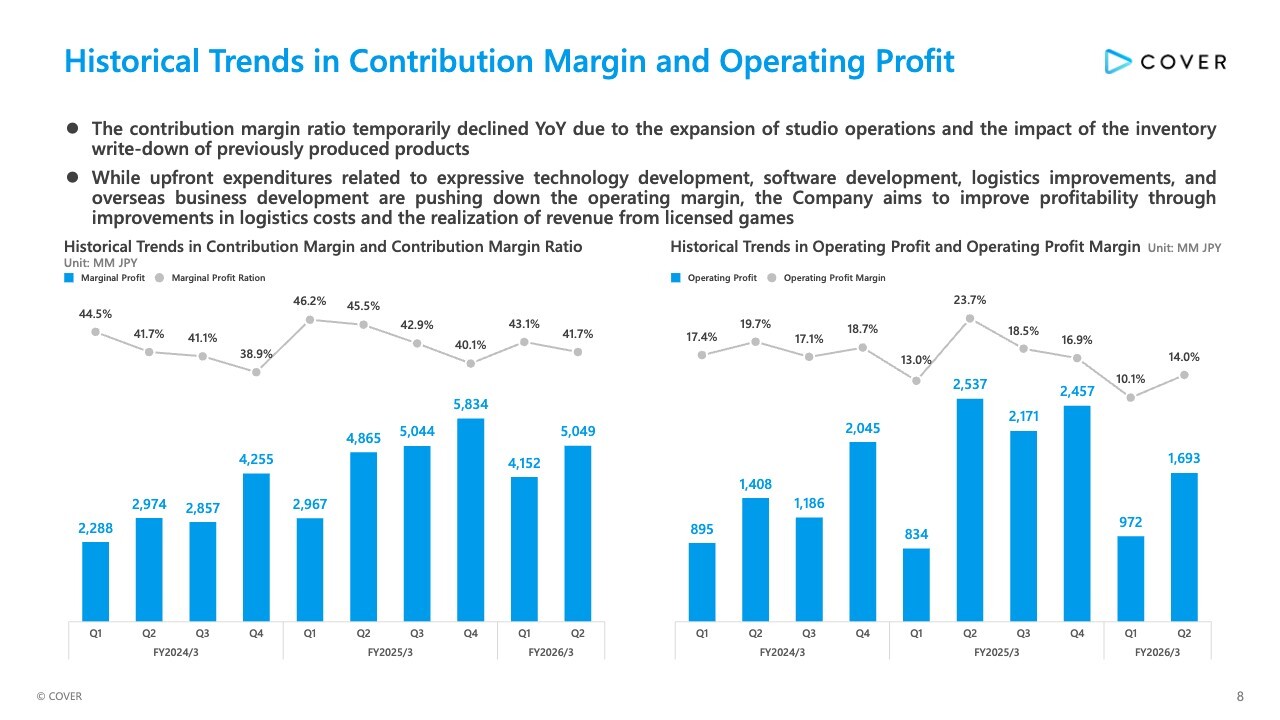 The historical trends in contribution margin and operating profit are shown here. The contribution margin ratio temporarily declined YoY, due to the expansion of studio operations and the impact of the inventory write-down of previously produced products.
