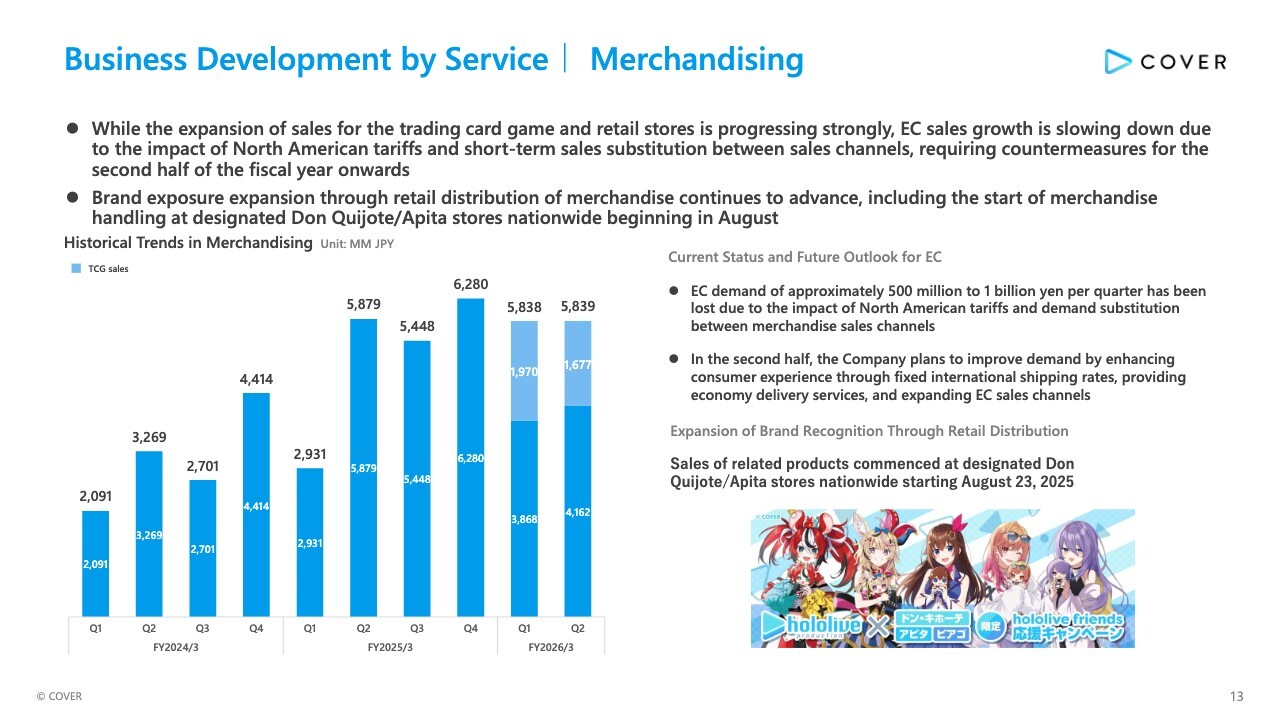 Here is an update on the business development of Merchandising. While the expansion of sales for the trading card game and retail stores is progressing strongly, EC sales growth is slowing down due to the impact of North American tariffs and short-term sales substitution between sales channels, resulting in quarterly revenue remaining flat YoY.