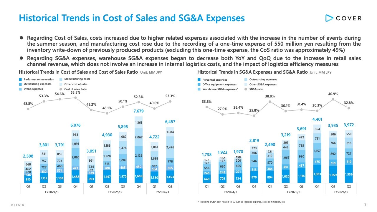 Here is the historical trends in cost of sales and SG&A expenses. Regarding cost of sales, costs increased due to higher event-related expenses associated with the increase in the number of events during the summer season, and manufacturing cost rose due to the recording of a one-time expense of ¥550 million resulting from the inventory write-down of previously produced products. Excluding this one-time expense, the CoS ratio was approximately 49%, indicating no significant change in the cost structure QoQ.