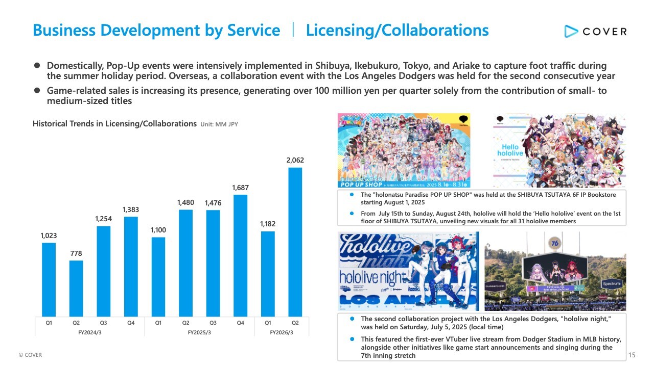 In Licensing/Collaborations, summer events jointly implemented with other companies performed well, and game-related sales is also gaining presence, exceeding ¥100 million per quarter solely through contributions from small and medium-sized game titles.
