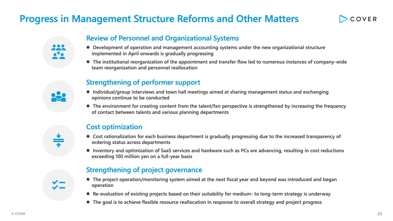 In strengthening performer support, we continue to hold Individual/group interviews and town hall meetings aimed at sharing management status and exchanging opinions. We also strengthening the environment for creating content from the talent/fan perspective by increasing the frequency of contact between performers and various planning departments.