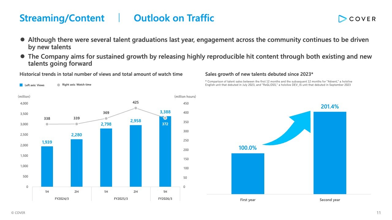 Due to several talent graduations, primarily last year, total content watch time in the first half of the current fiscal year declined by just over 10% compared with the second half of the previous fiscal year. However, views of our video content continue to trend upward thanks to the reach expansion driven by accumulated content such as music videos, short-form content like YouTube Shorts, and the acquisition of new fans through newly debuted talents.