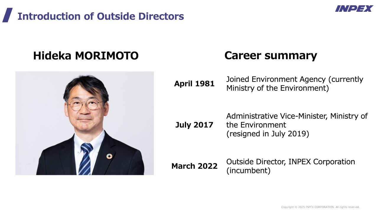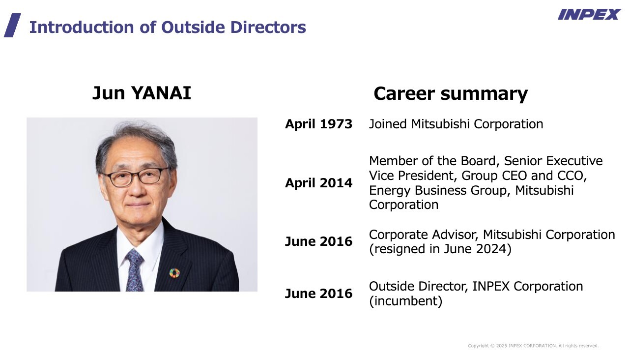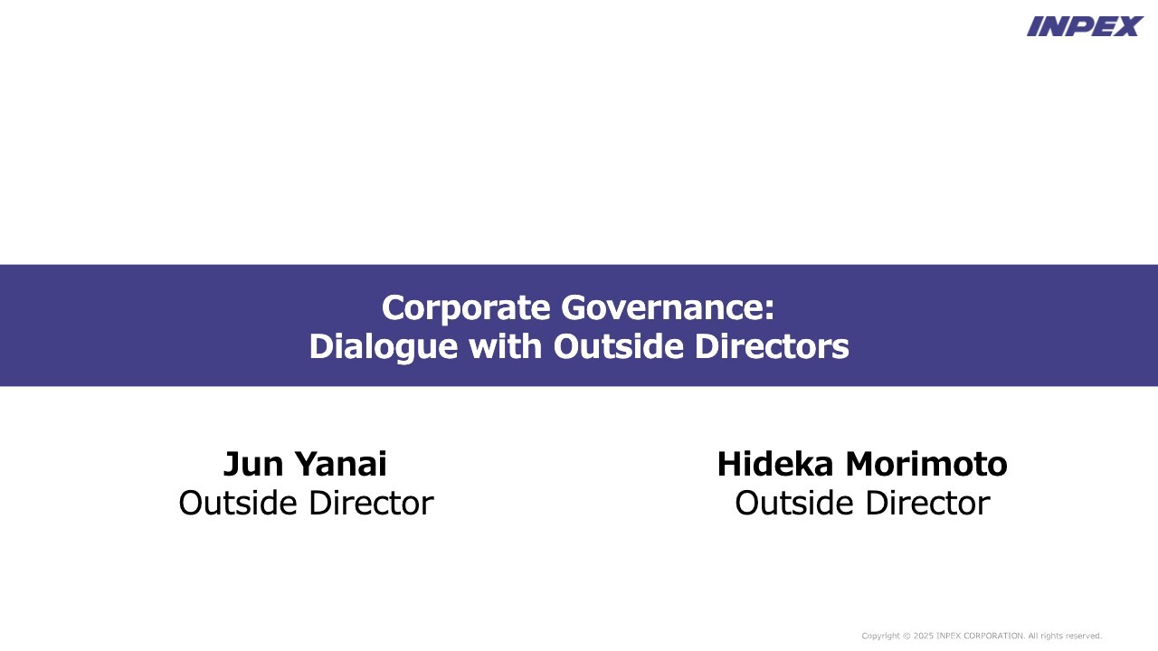 In the first half of the session, outside directors Jun Yanai and Hideka Morimoto will talk about the roles they have played in governance and their expectations for INPEX's future growth. In the second half, we will take questions.