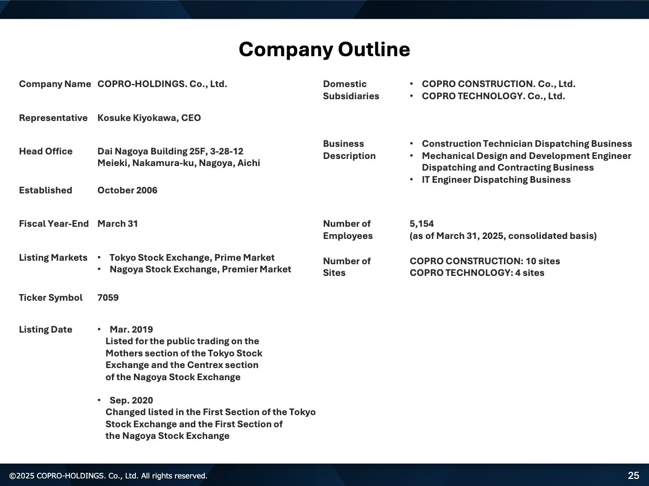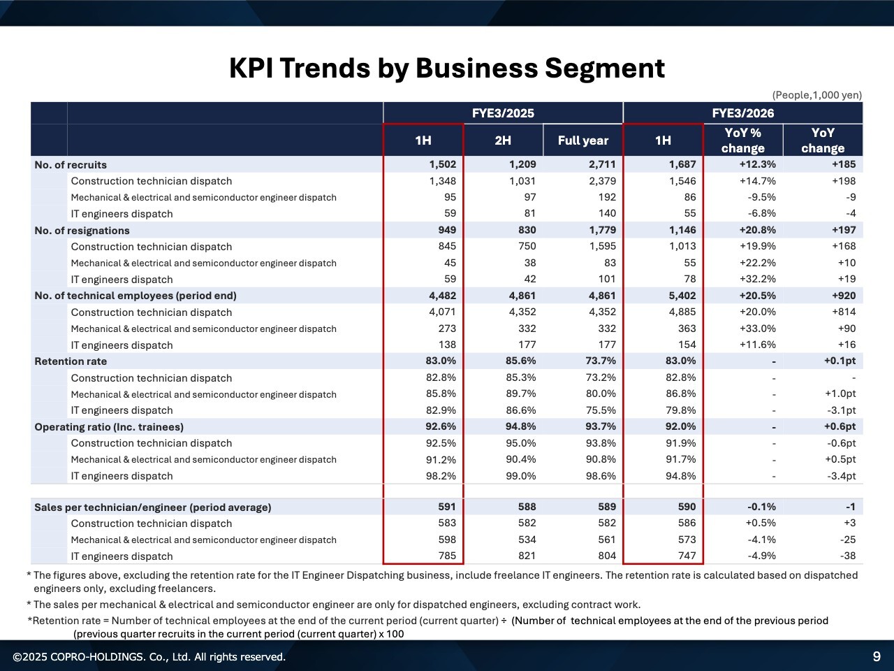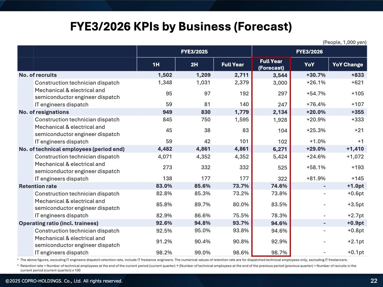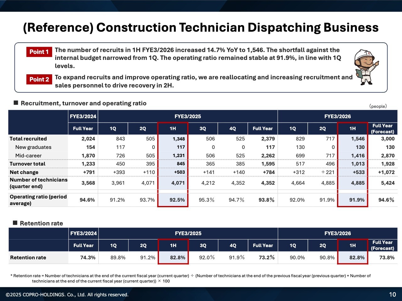 Point 3.Strong growth continues, supported by robust demand for human resource services. In the construction technician dispatching business, we will expand the recruiting, strengthen deeply-cultivated sales activities to targeted companies, and promote team-based dispatching to steadily recover 1H shortfall in 2H.