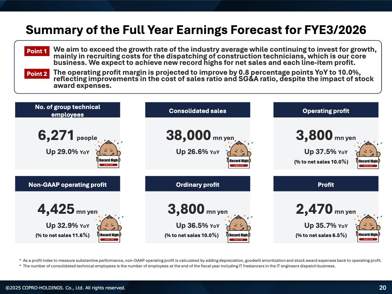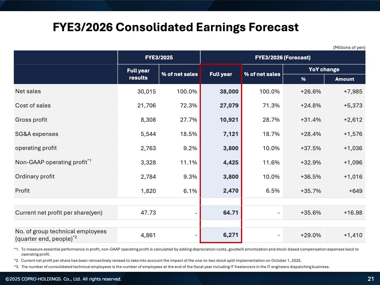 We forecast the number of group technical employees to increase by 29% YoY to 6,271 people, consolidated sales to increase by 26.6% YoY to ¥38,000 million, and operating profit to increase by 37.5% YoY to ¥3,800 million.