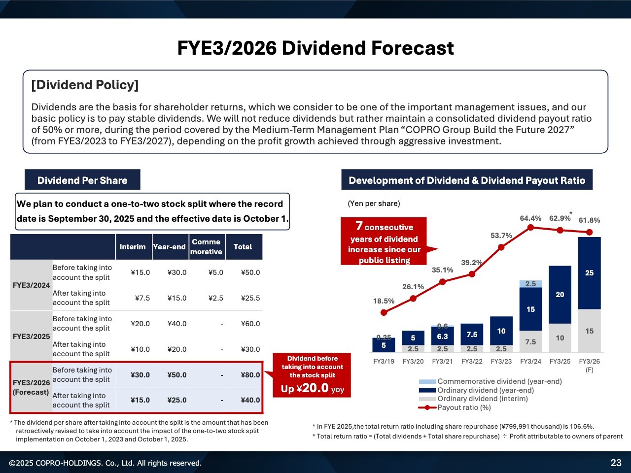 For FYE3/2026, highlighted in red on the slide, we will pay an interim dividend of ¥30 on a pre-split basis. The year-end dividend was previously projected at ¥50 on a pre-split basis. However, owing to the two-for-one stock split, the year-end dividend on a post-split basis will be ¥25.