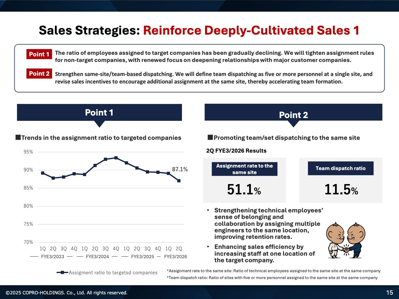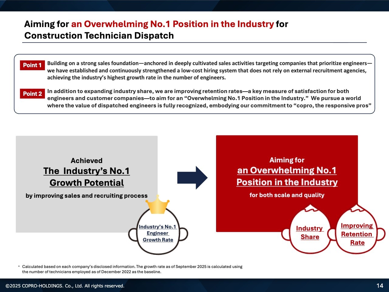 We identify two points. Point 1 involves building on a strong sales foundation—anchored in deeply cultivated sales activities targeting companies that prioritize engineers—we have established and continuously strengthened a low-cost hiring system that does not rely on external recruitment agencies. With this as our foundation, we aim for an overwhelming No.1 position in the industry.
