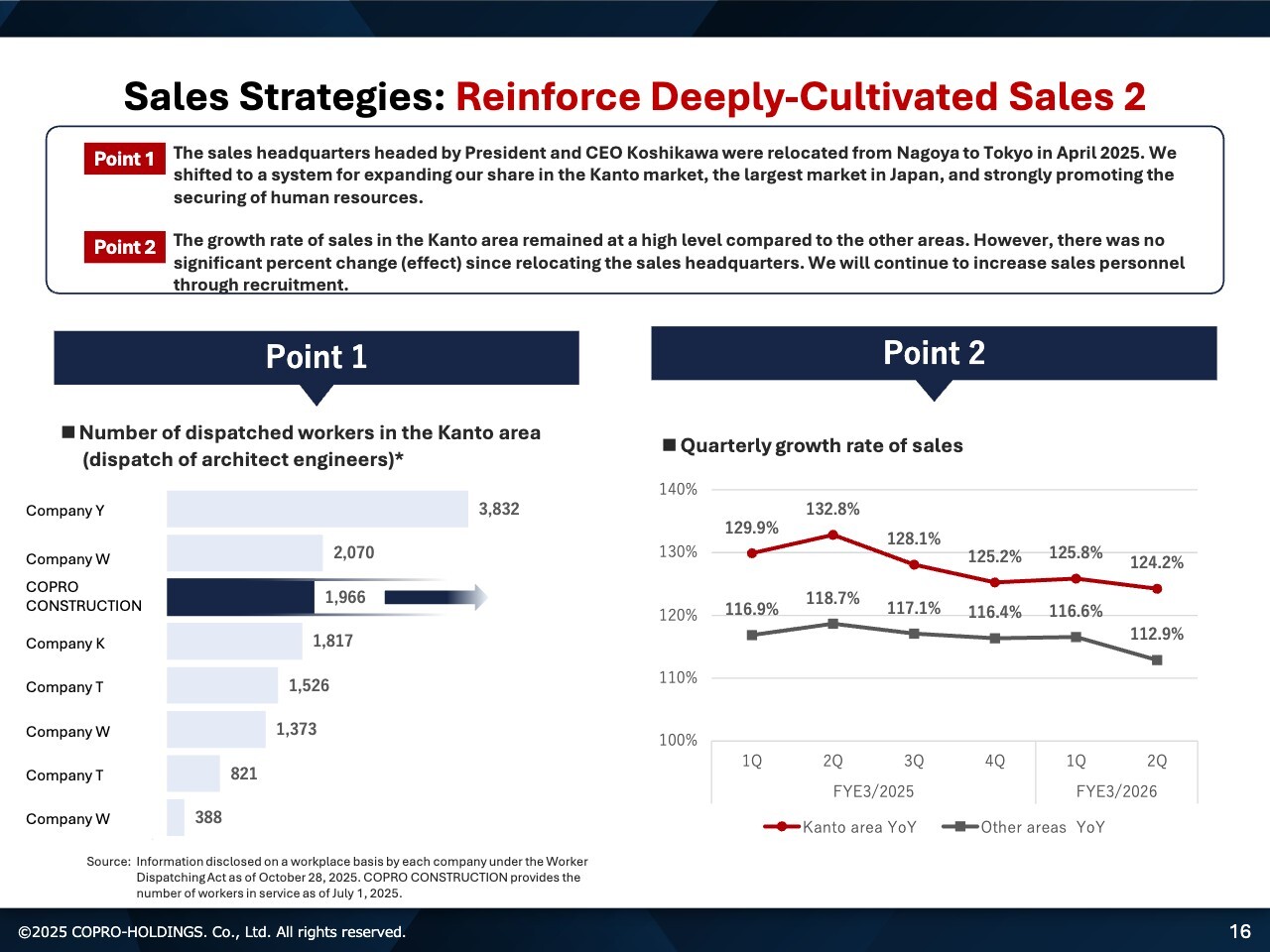 Kiyokawa: I will explain the second measure to reinforce deeply-cultivated sales in the sales strategies. The graph in Point 1 on the left side of the slide shows the number of dispatched workers in the Kanto area. The line graph in Point 2 on the right side of the slide shows the quarterly growth rate of sales.