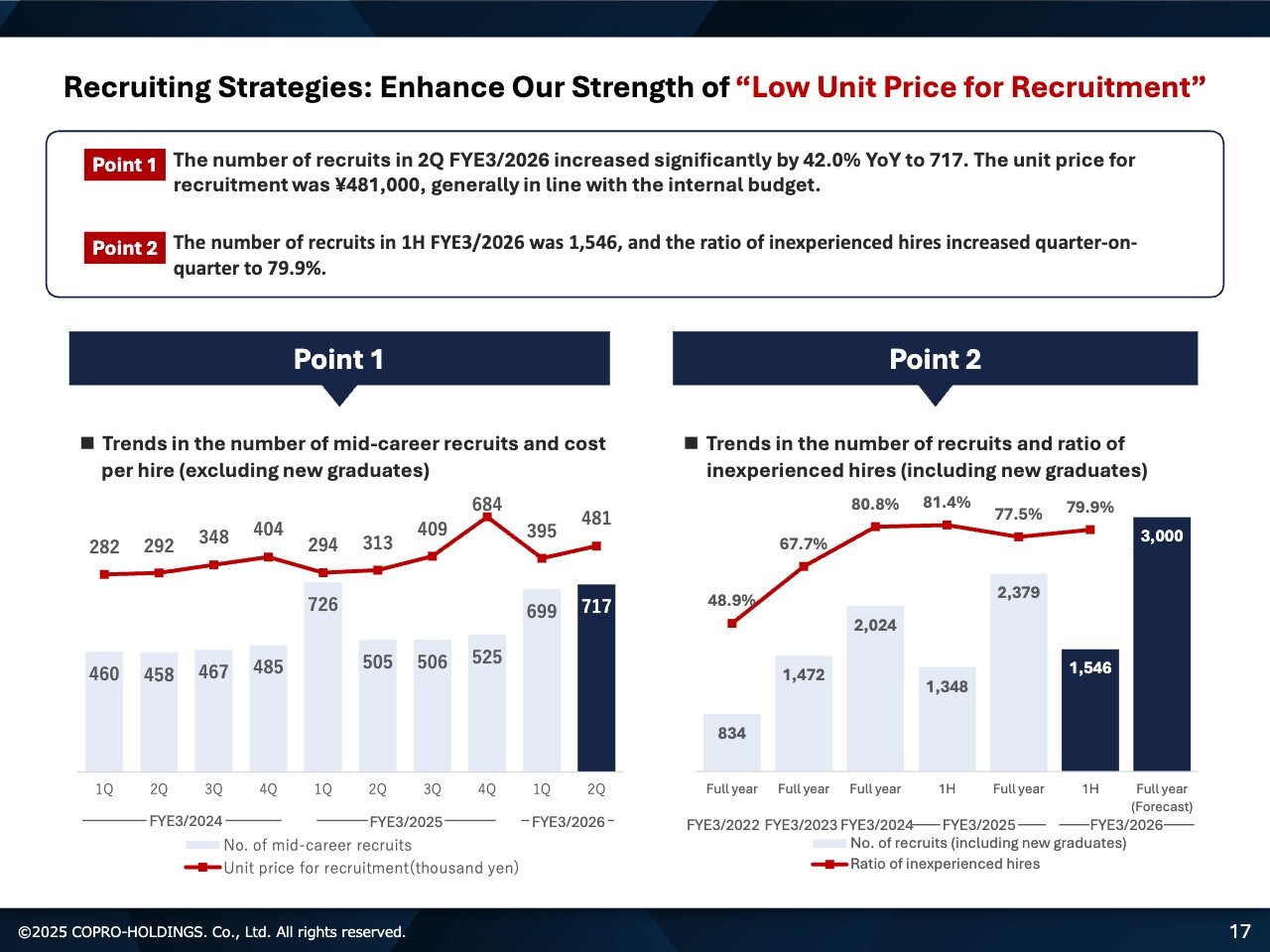 Point 1. The number of recruits was 699 and 717 people for 1Q and 2Q FYE3/2026, respectively. The unit price for recruitment was ¥395,000 in 1Q and rose slightly to ¥481,000 in 2Q. This figure is driven by the recruitment budget allocated as an investment and the number of recruits achieved.
