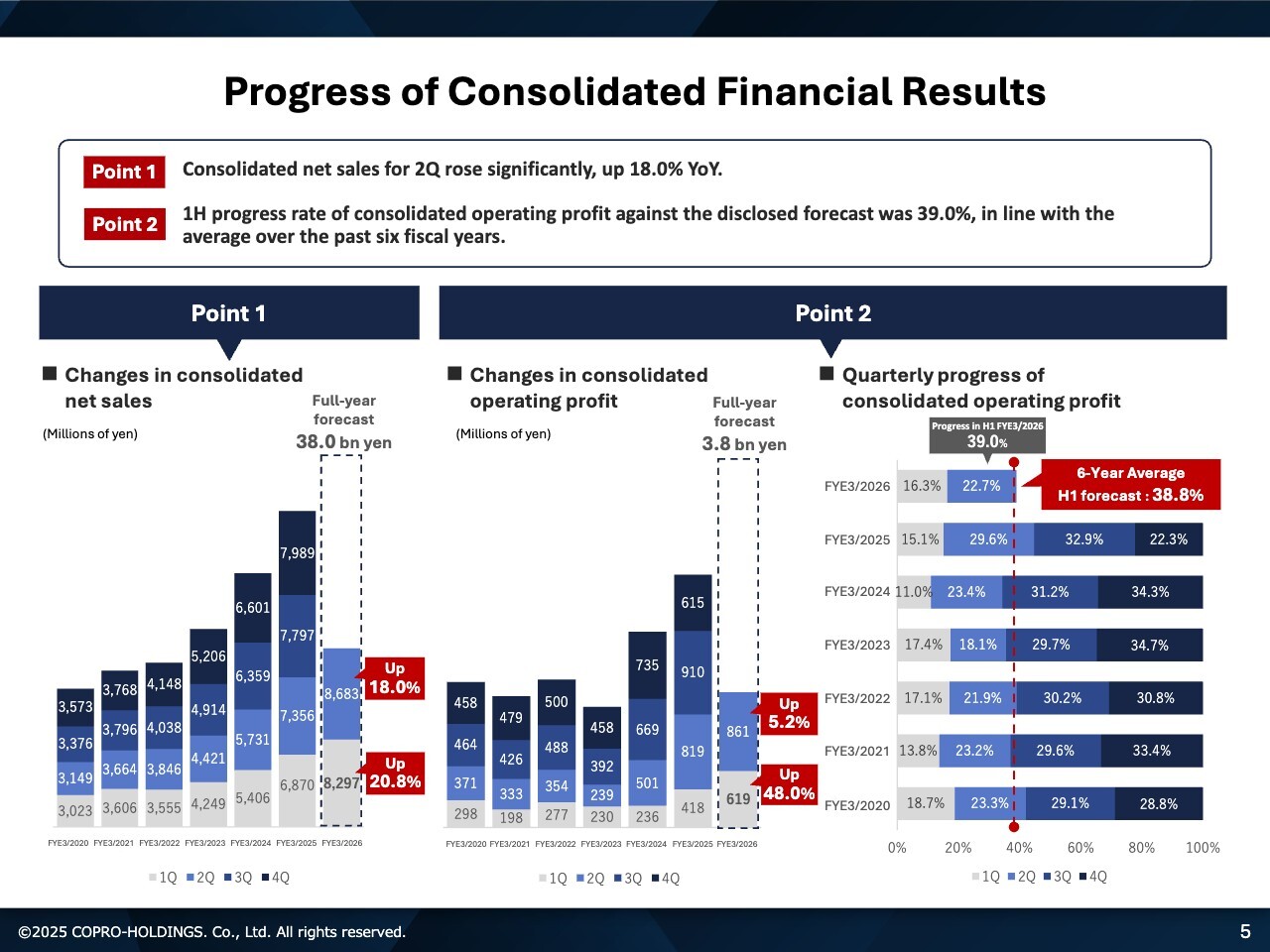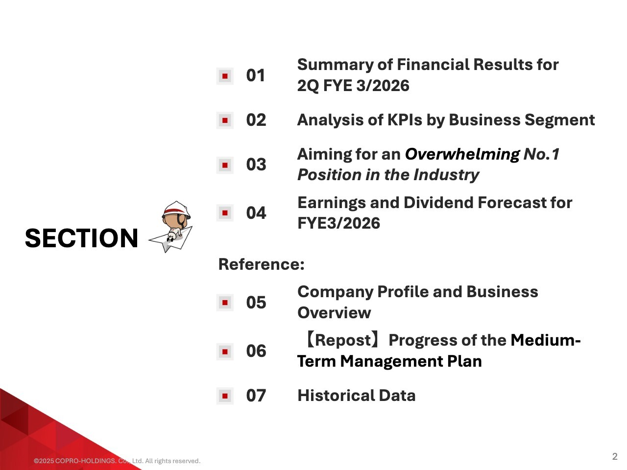 Kosuke Kiyokawa (hereinafter “Kiyokawa”): Good evening, everyone. I am Kosuke Kiyokawa, CEO of COPRO-HOLDINGS. Co., Ltd. Thank you all for taking the time out of your busy schedules to join us today. I will now begin the financial results briefing for 2Q FYE3/2026.