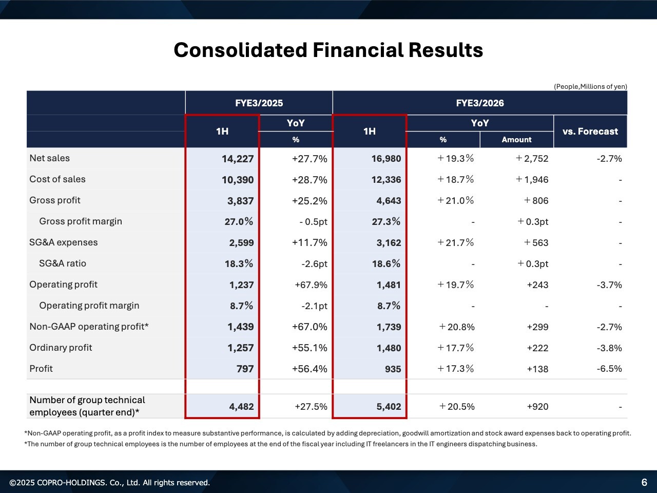 I will explain the six key figures. The number of group technical employees was up 20.5% YoY to 5,402 people, consolidated sales were up 19.3% YoY to ¥16,980 million, and operating profit was up 19.7% YoY to ¥1,481 million.