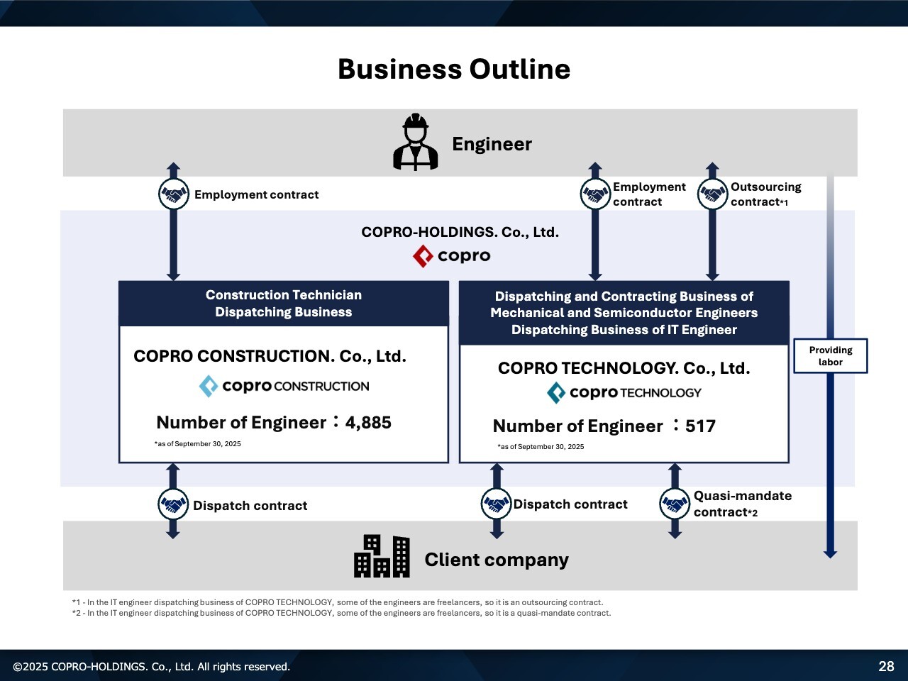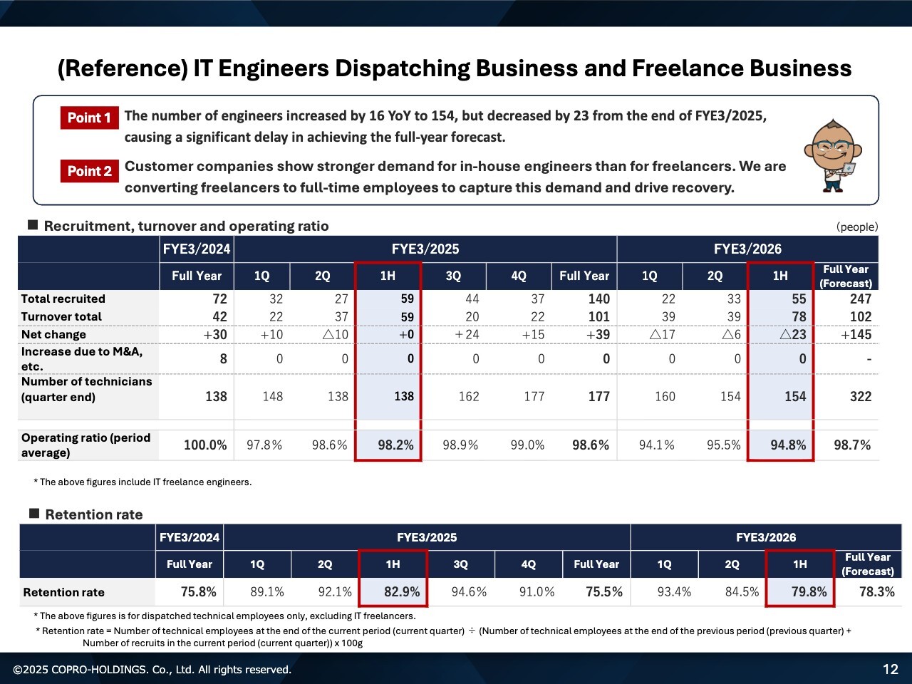 Kiyokawa: In the IT engineers dispatching business, the number of engineers has not increased compared to FYE3/2025. The biggest challenge in this field is that customer companies show stronger demand for dispatched staff directly employed by our company than for freelancers.