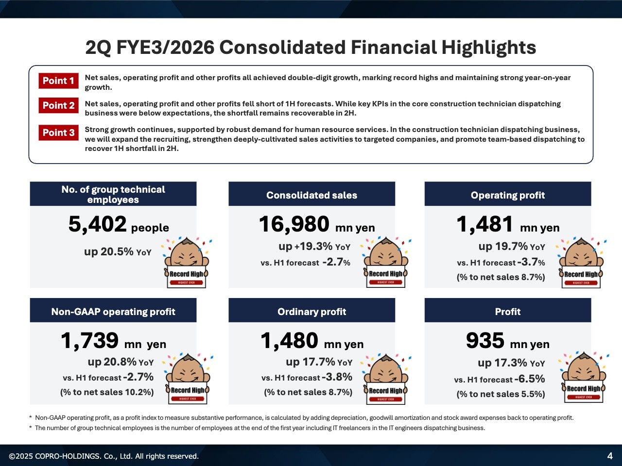Answer: The 2Q results fell slightly short of our expectations. While customer demand remains exceptionally high, operating ratios struggled to improve. The main reason was a shortage of sales personnel, leading to delayed assignments and an increase in standby engineers. We regret that sales staff recruitment has not kept pace with business growth. In 2H, we will increase headcount through new hires to improve both the number of active engineers and operating ratios.