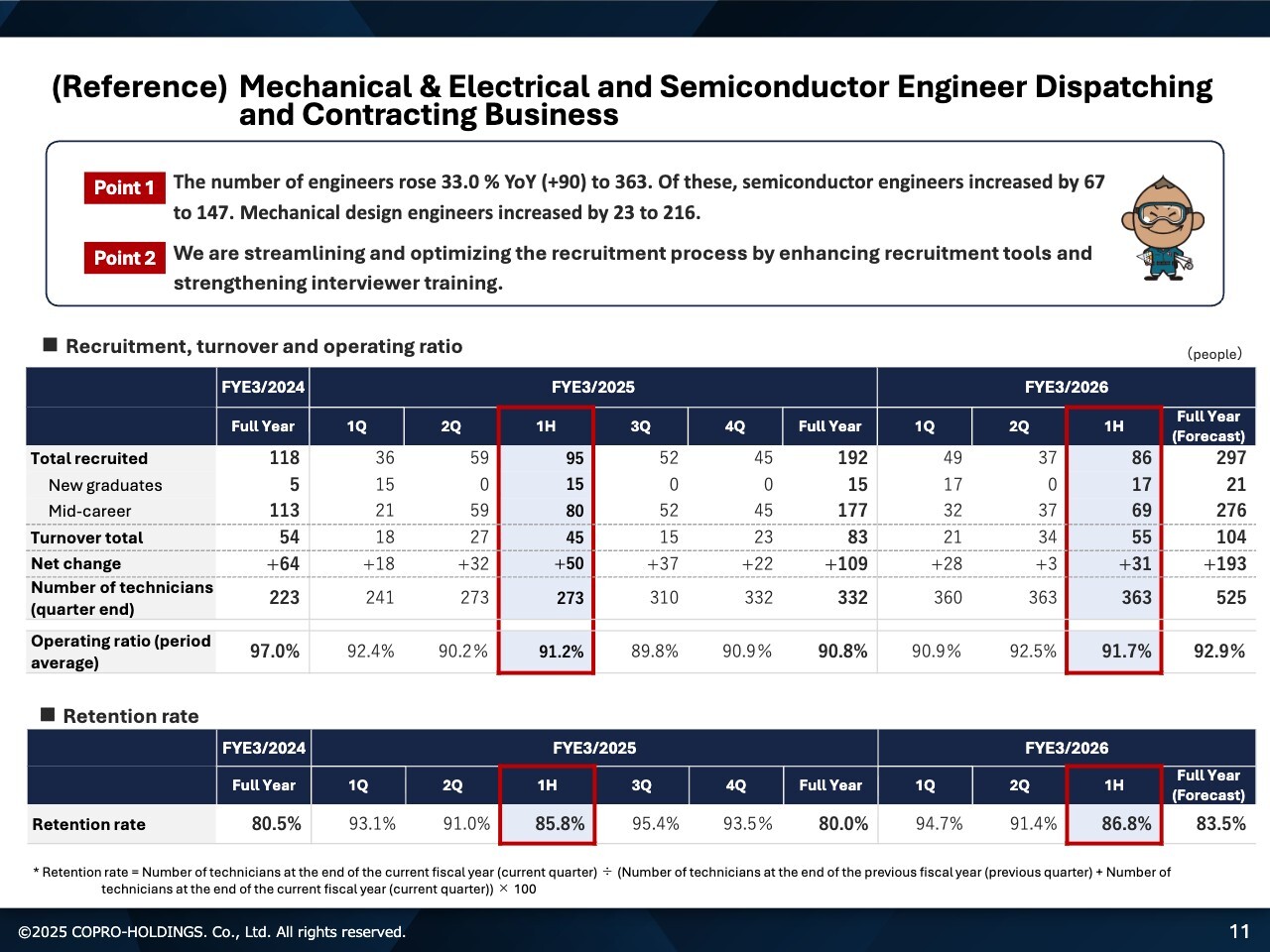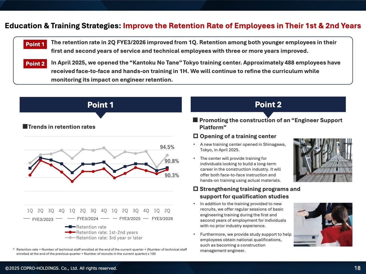 Point 1. In 2Q FYE3/2026, the retention rate improved from 1Q for both younger employees in their first to second year and technical employees in their third year and beyond.