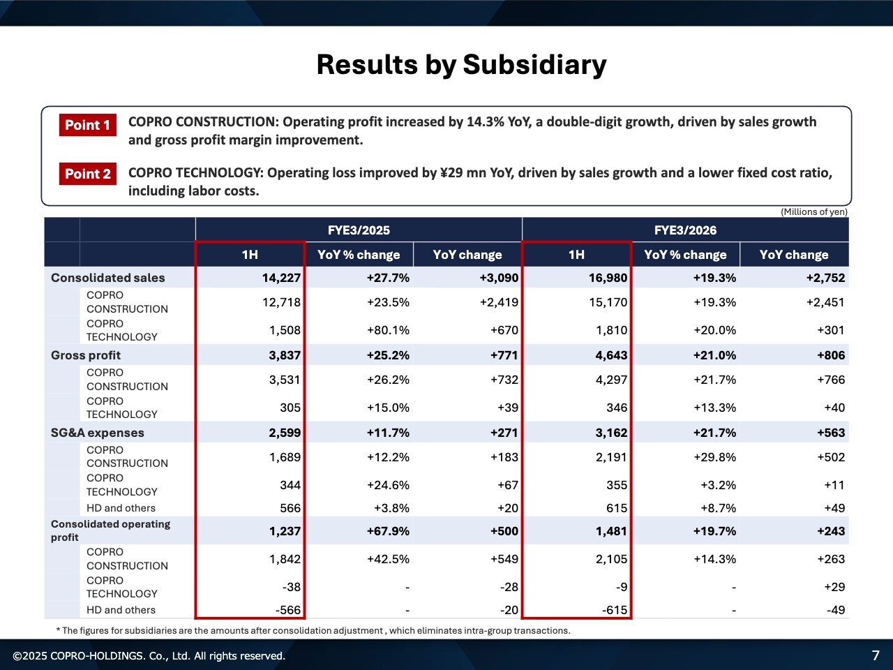 Kiyokawa: I will now explain the results by subsidiary. As Point 1, COPRO CONSTRUCTION achieved operating profit increased by 14.3% YoY, a double-digit growth, driven by sales growth and gross profit margin improvement in our core construction field.