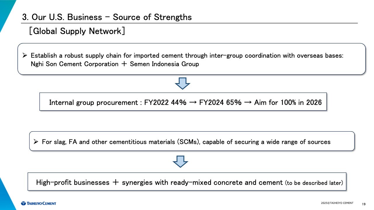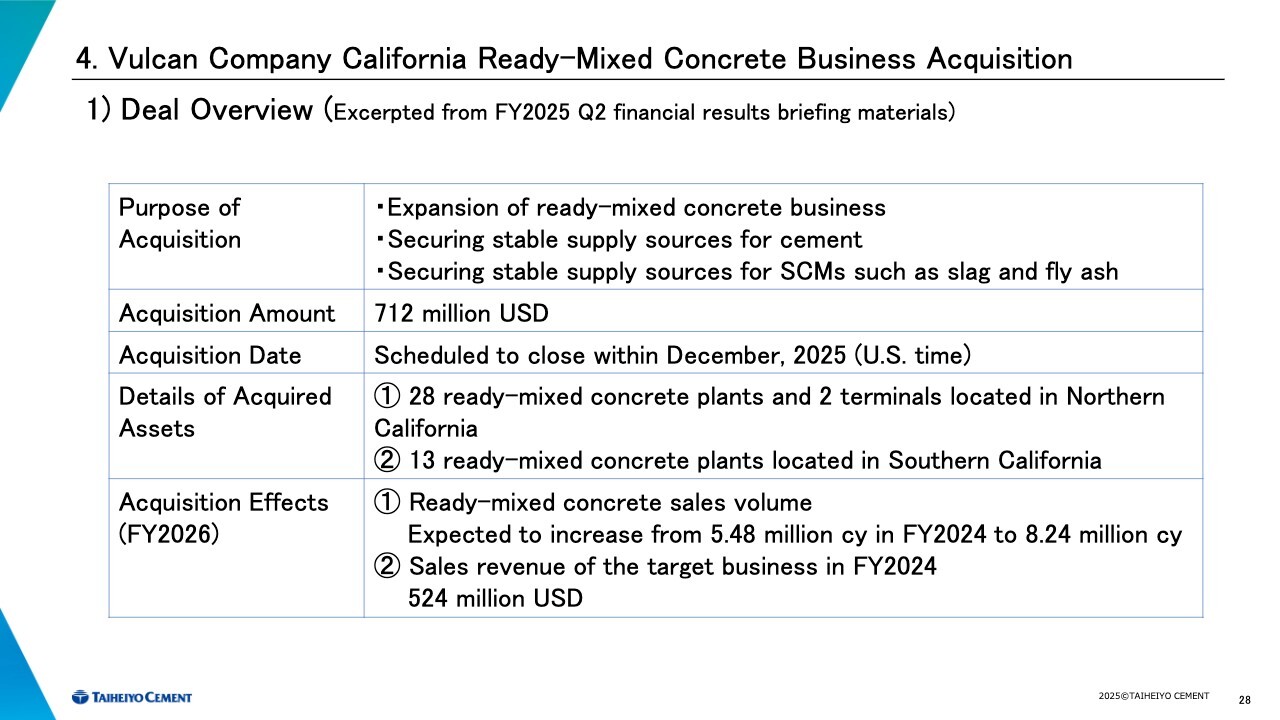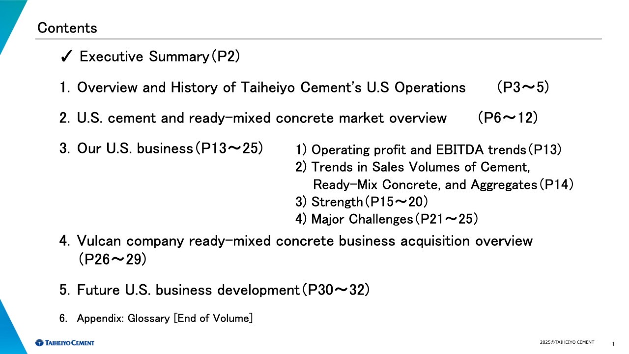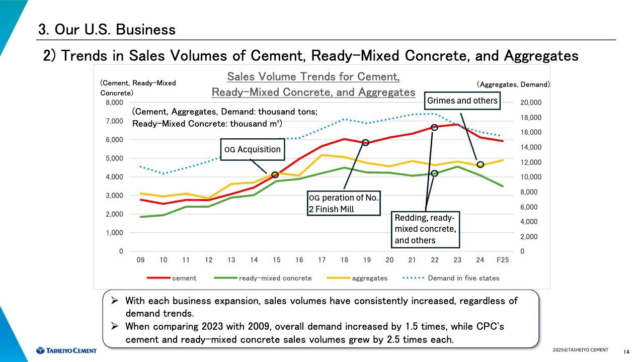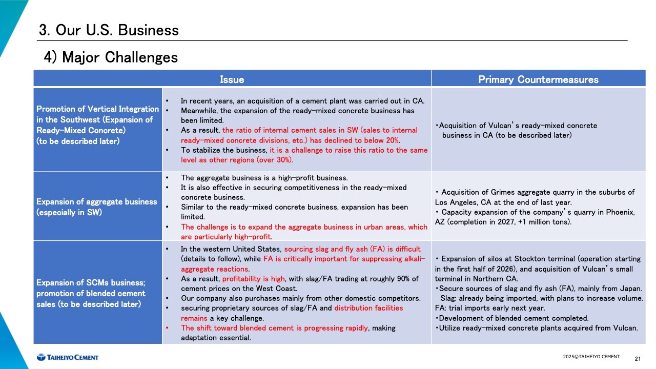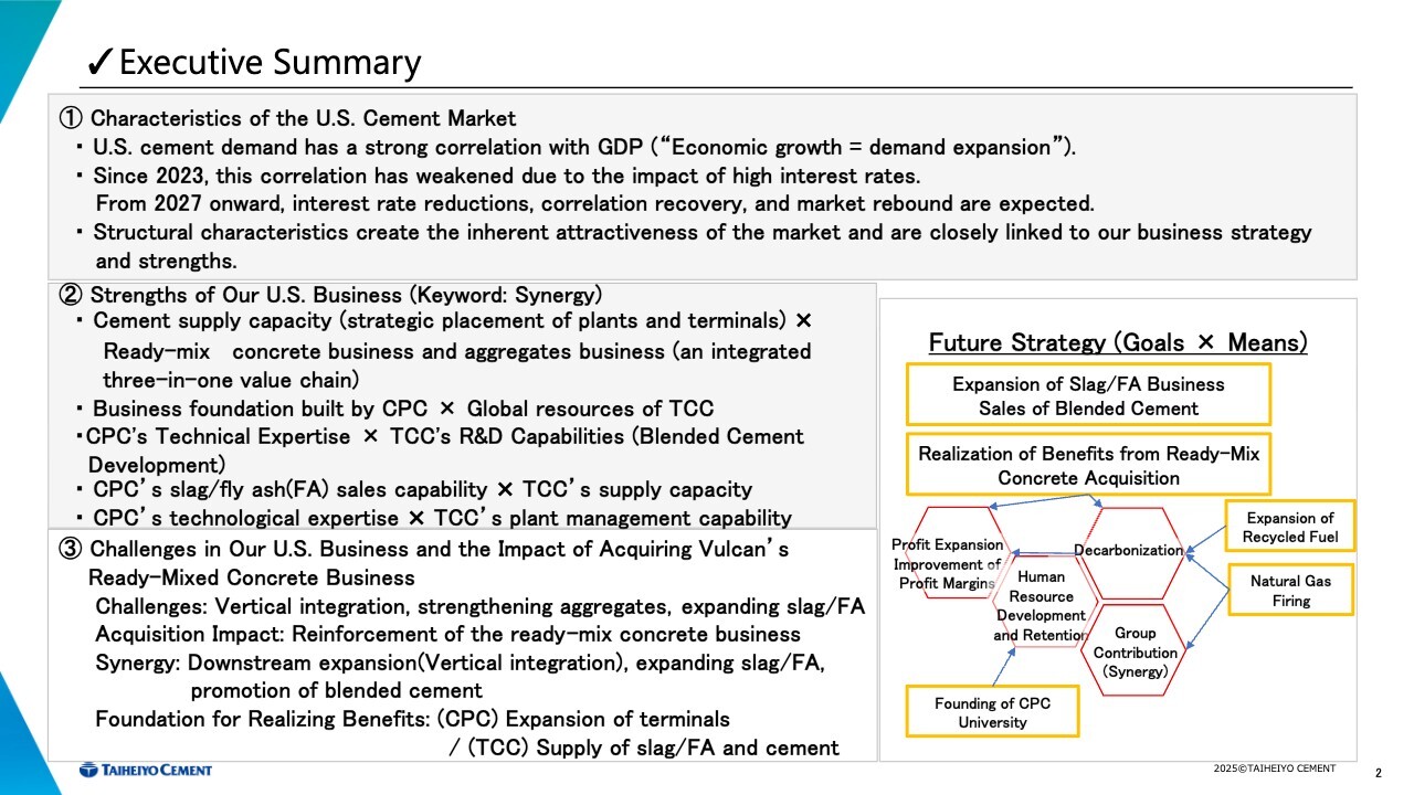 The second point is how we strategically approach the U.S. market. Third, the acquisition benefits of the ready-mixed concrete business acquired from Vulcan Materials Company. I will discuss these topics today.