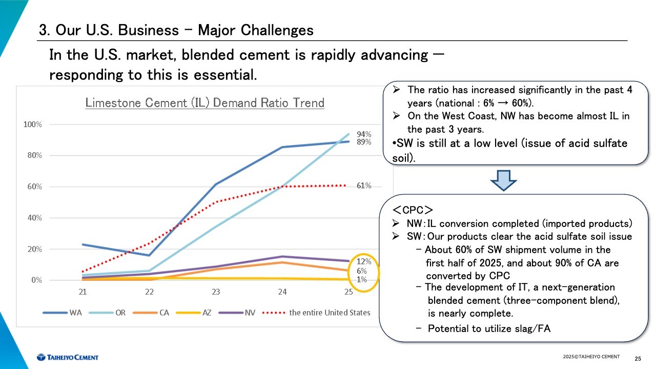 In addition, CPC moved swiftly from 2023 to 2024 to convert its imported products to Type IL cement. We believe this shift, combined with strong government leadership—particularly long-standing guidance from transportation authorities promoting low-carbon cement and concrete—has been a major driver of adoption.